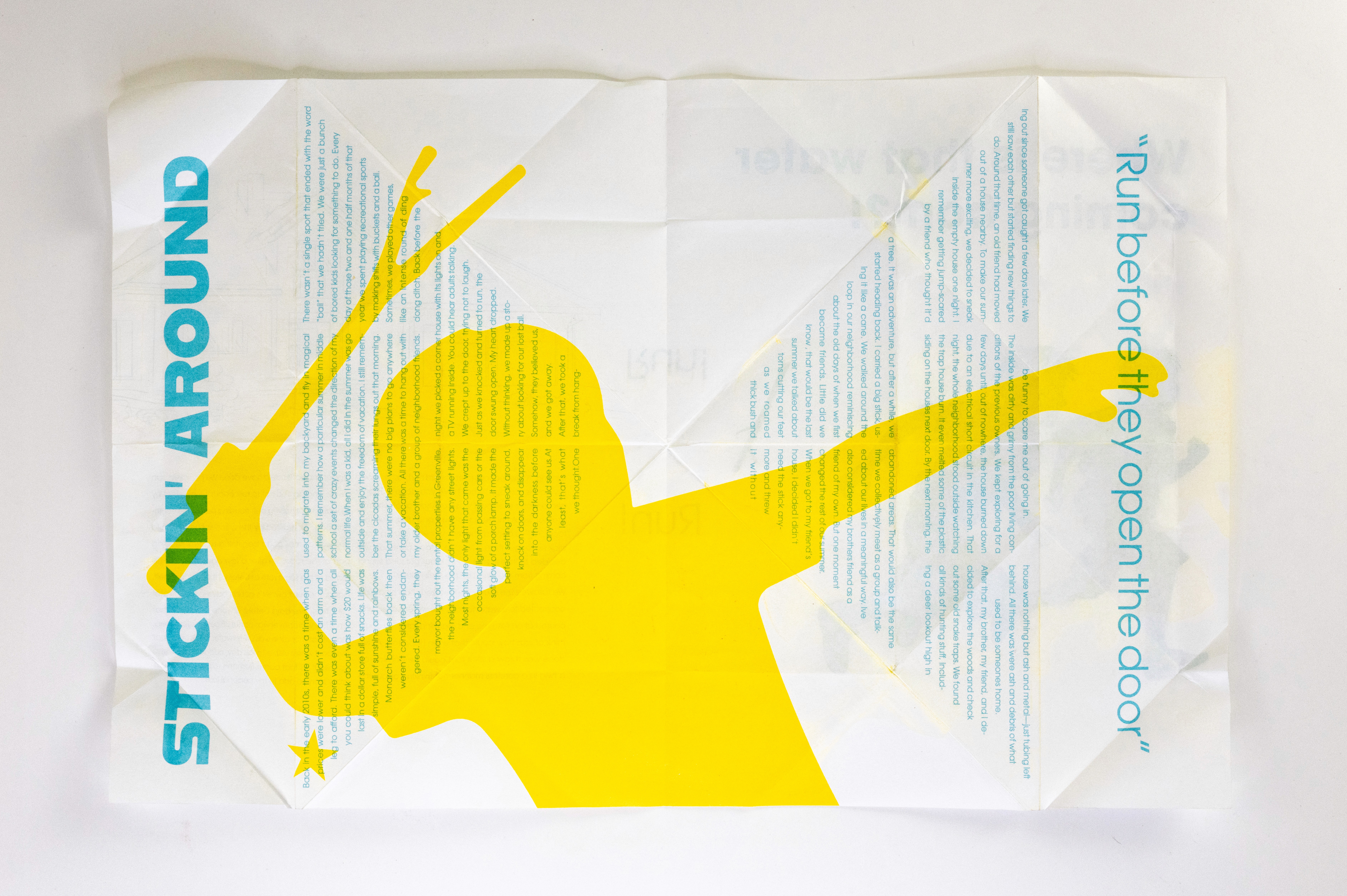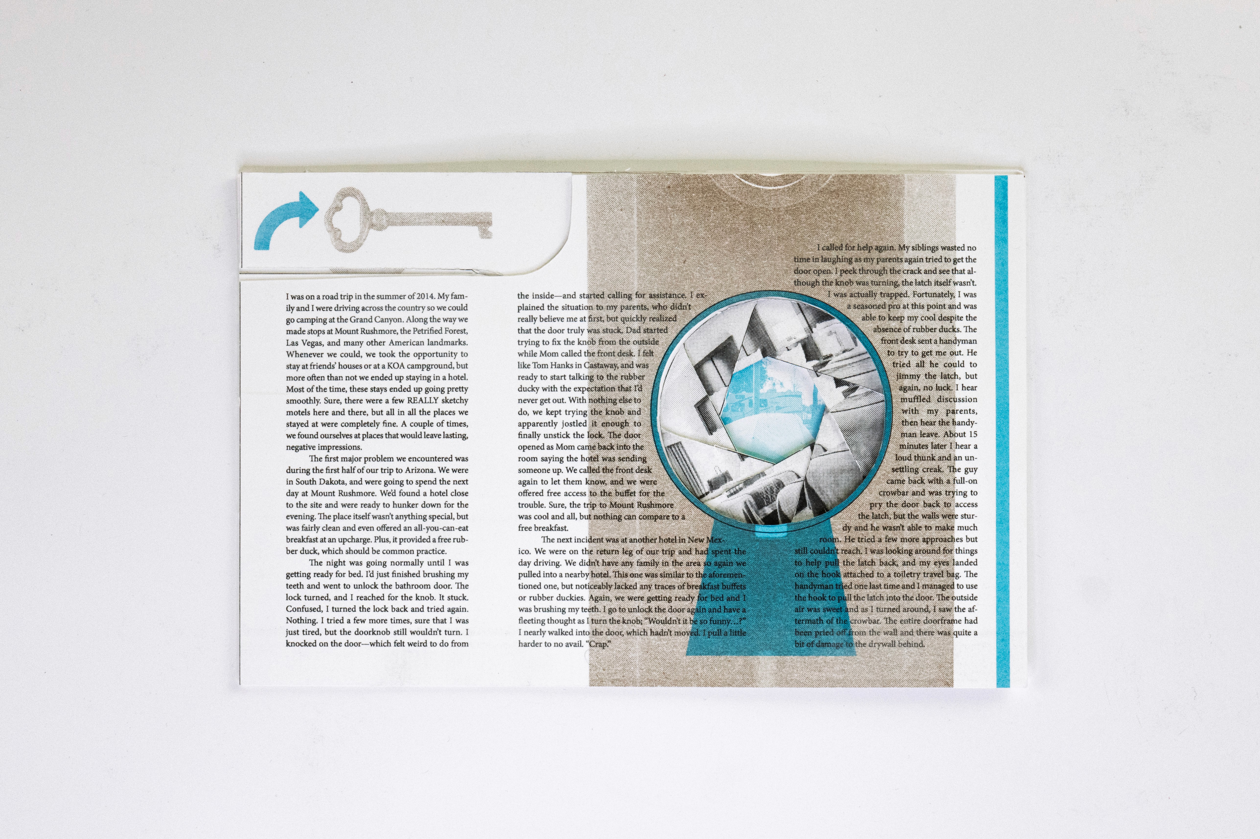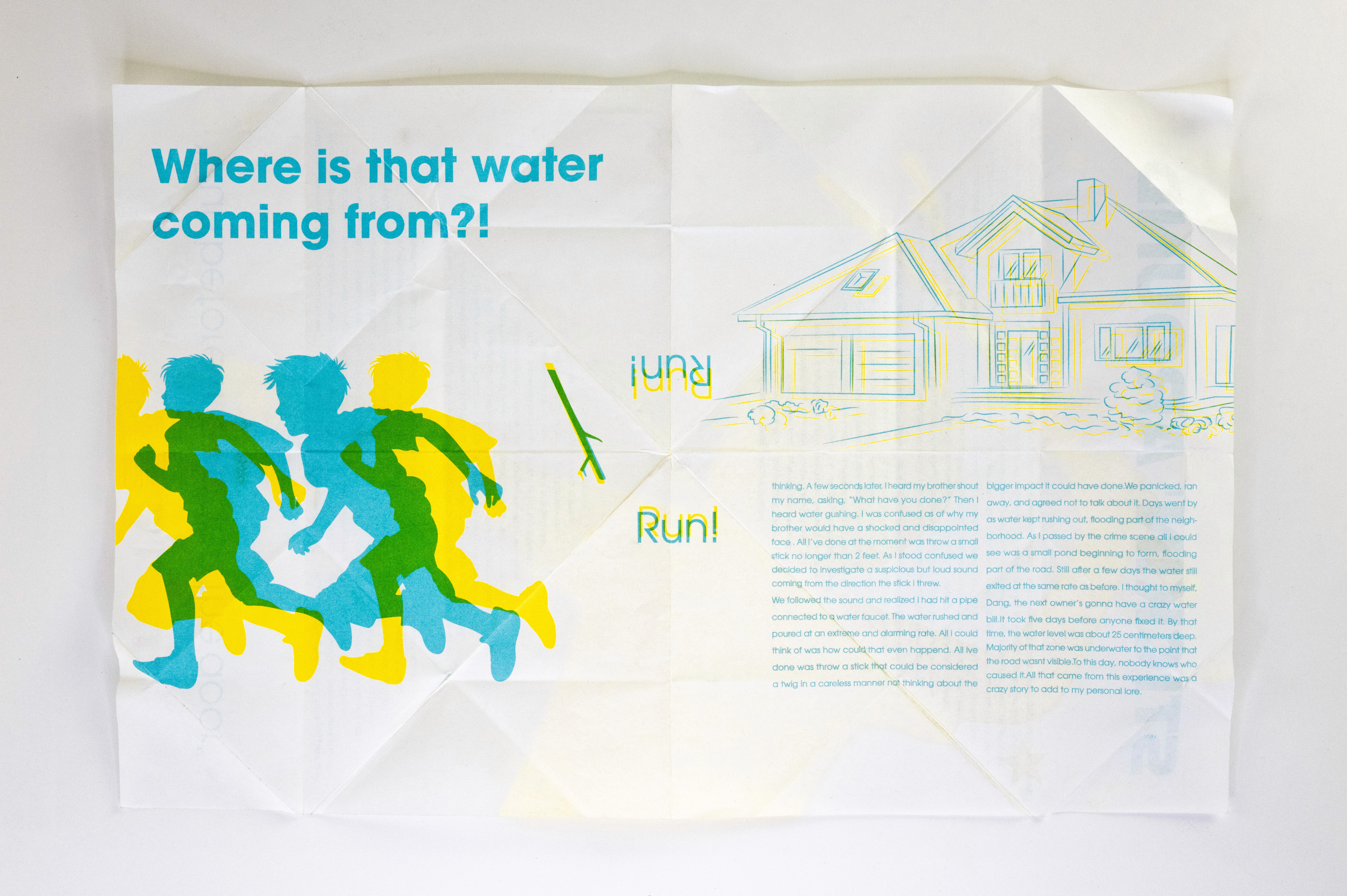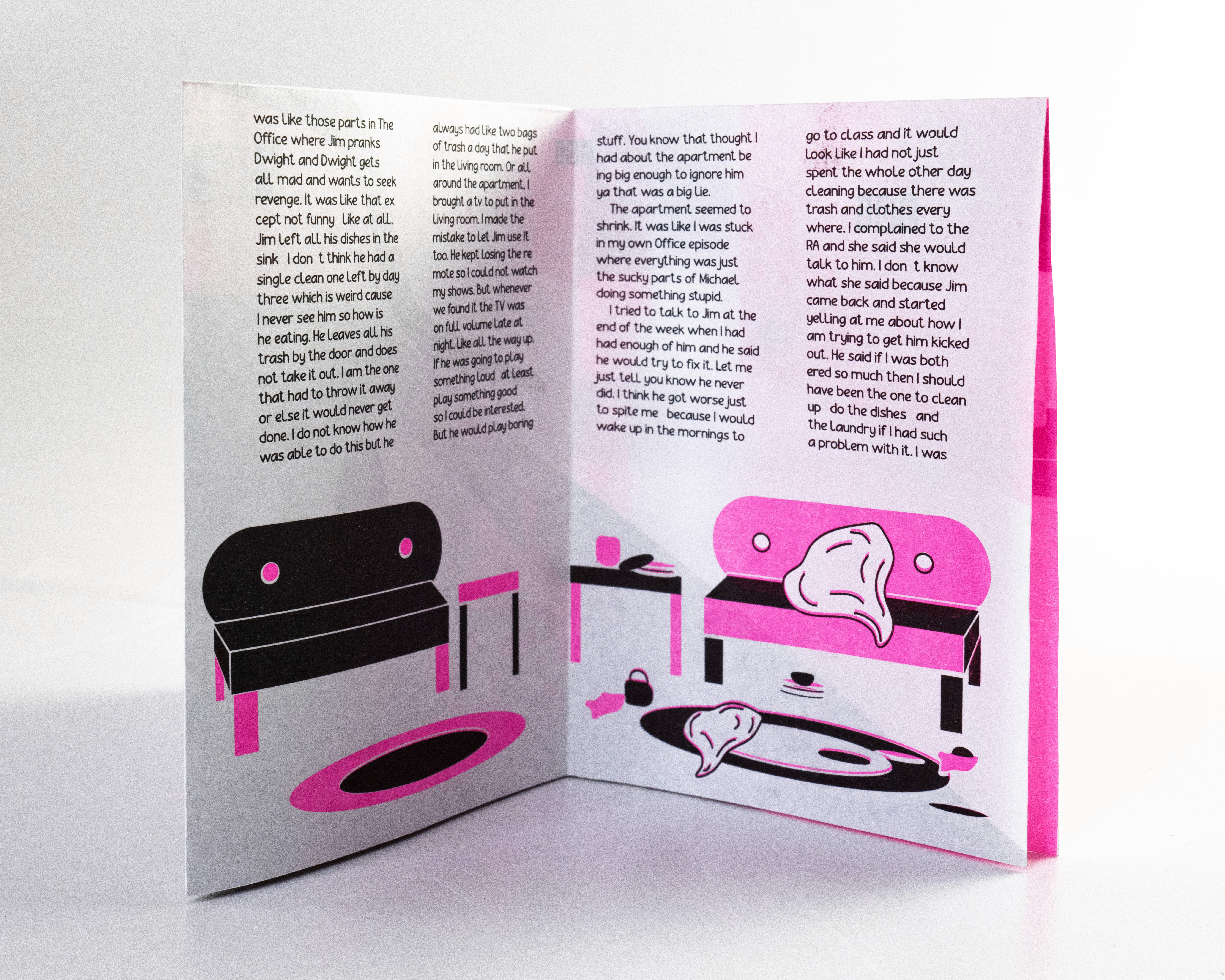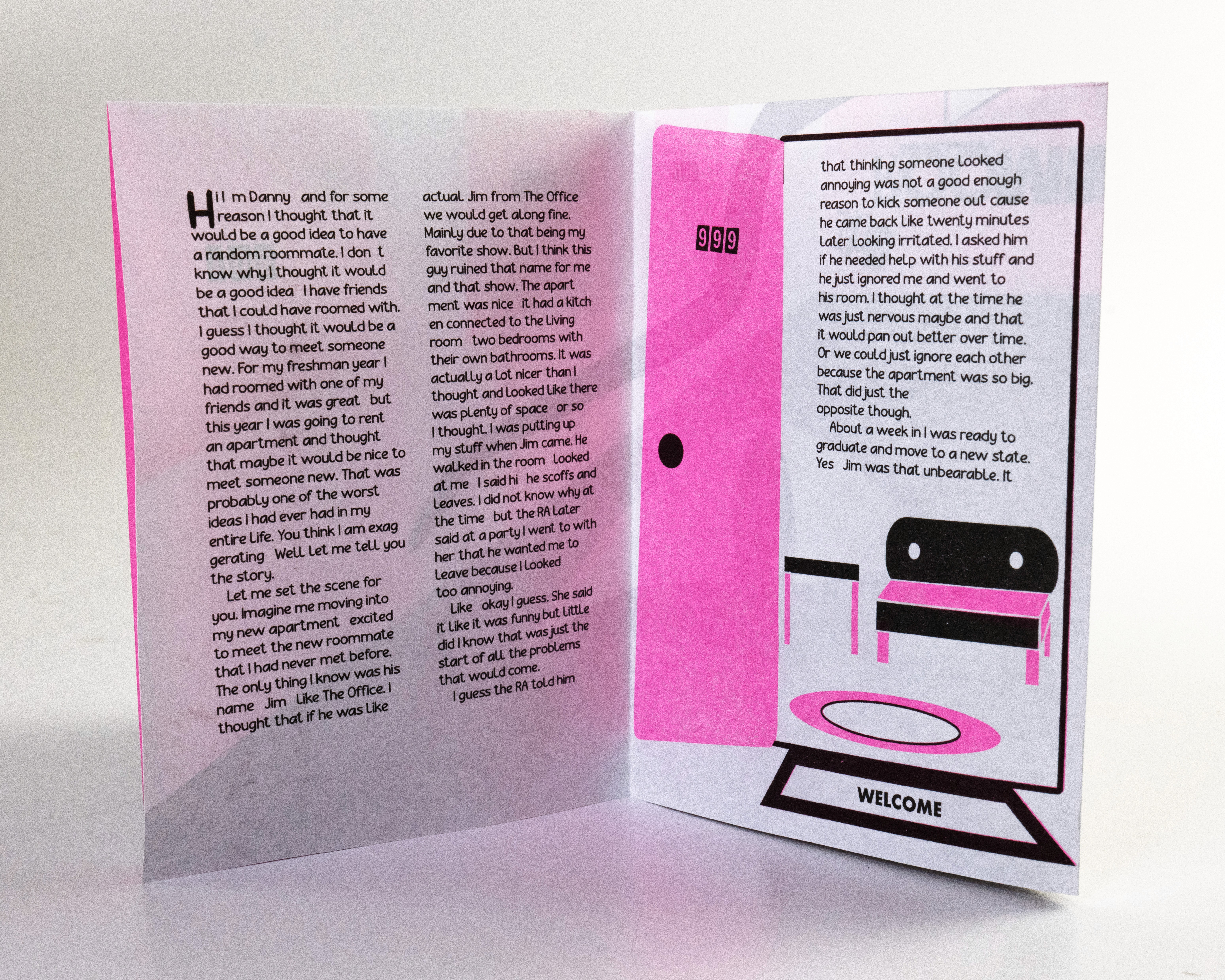 In this project students were prompted to write a thousand word narrative to design a composition from. This story could be fiction or a story from their life. They were given three additional conditions. One, they were only permitted a single sheet of tabloid paper. Two, the paper must be folded or cut in some way. And three, the final composition must be printed a RISO duplicator.