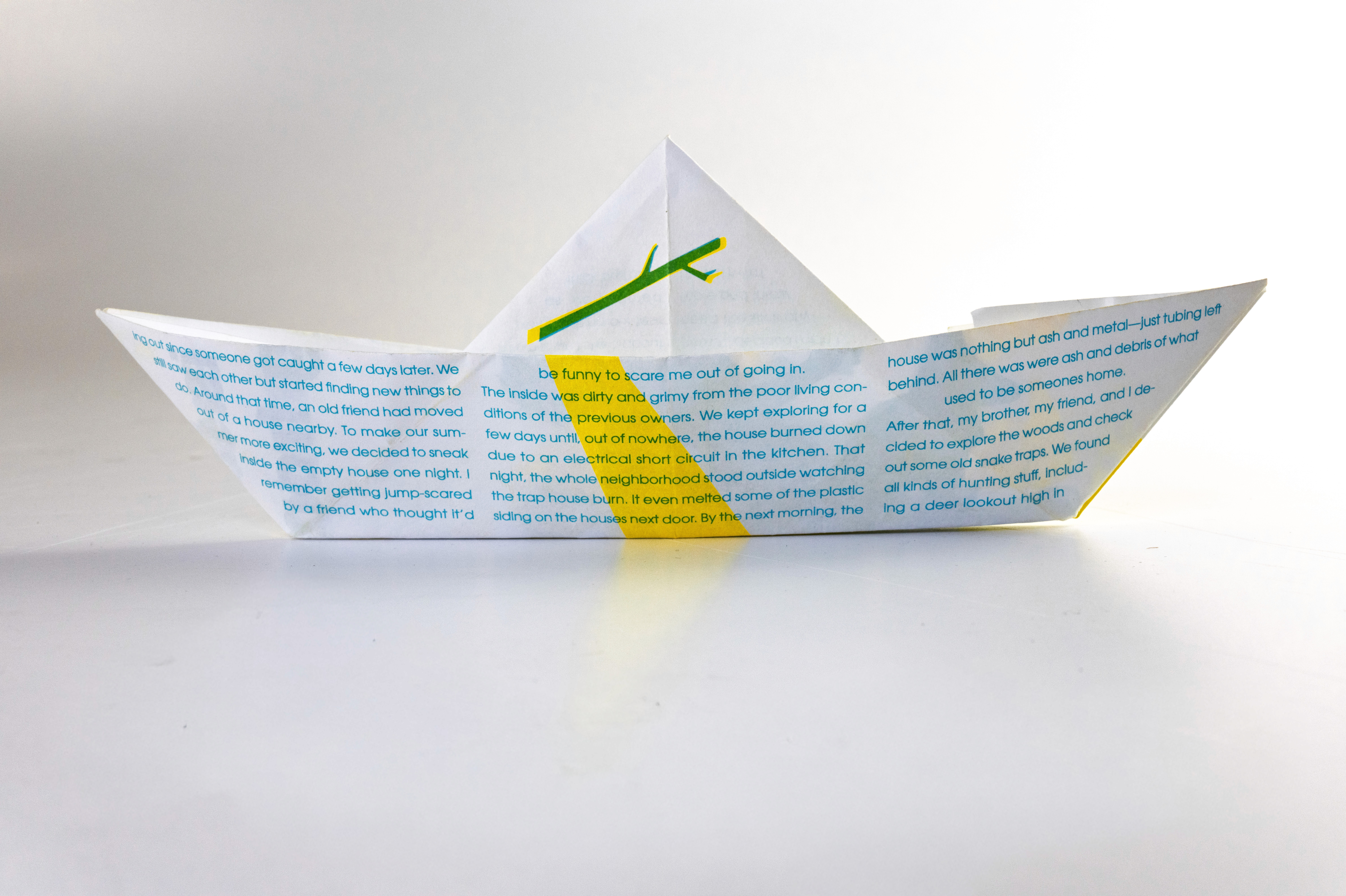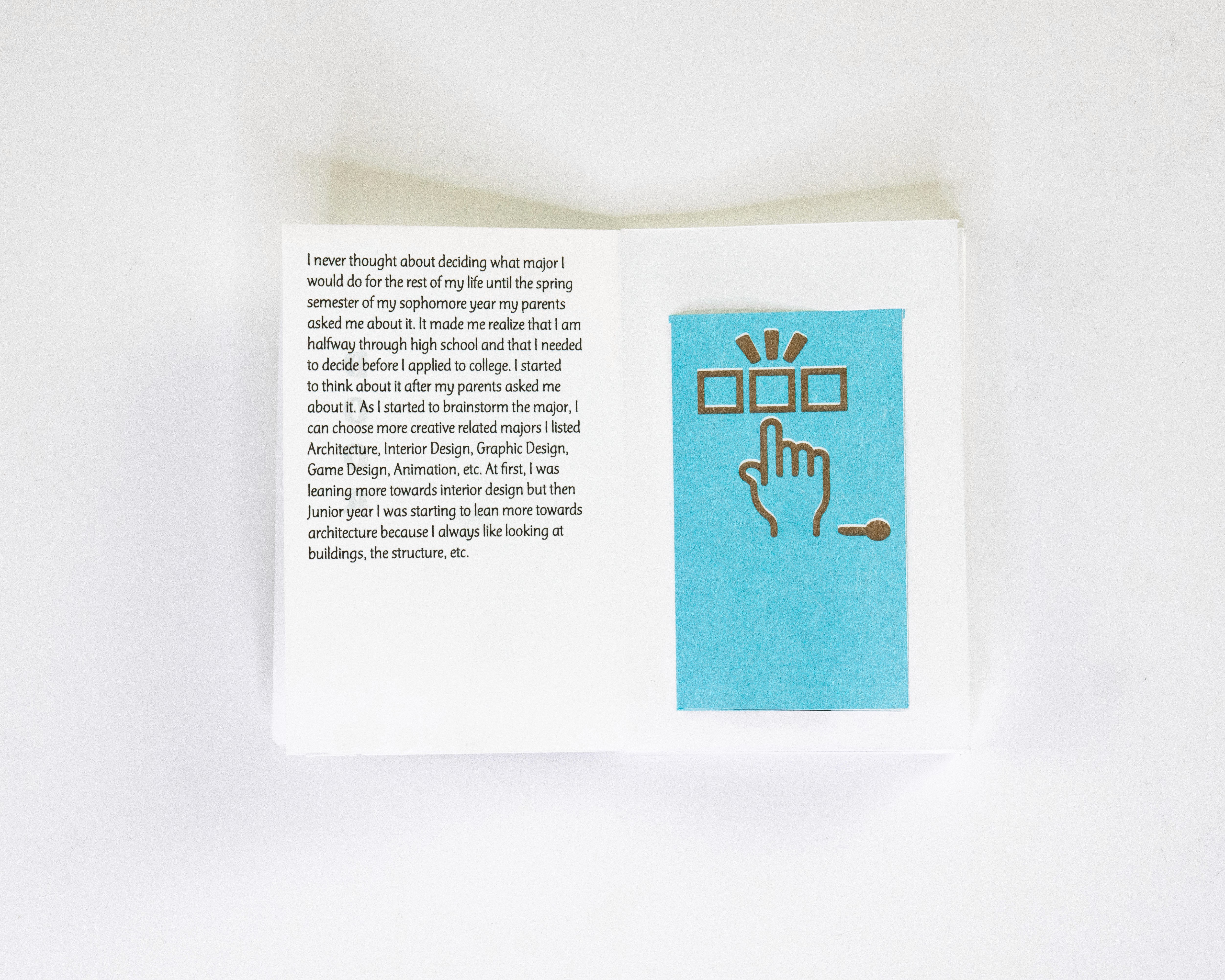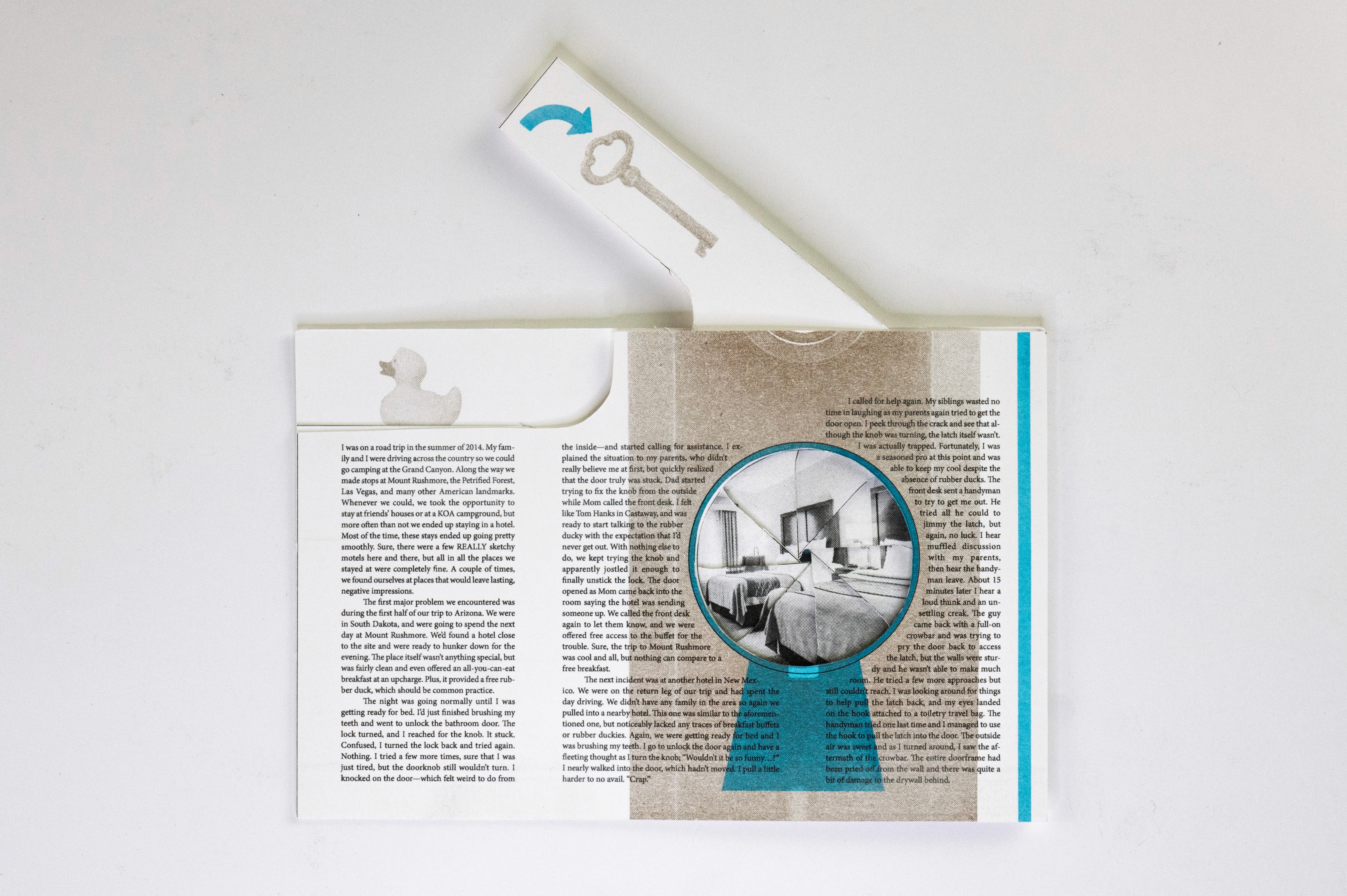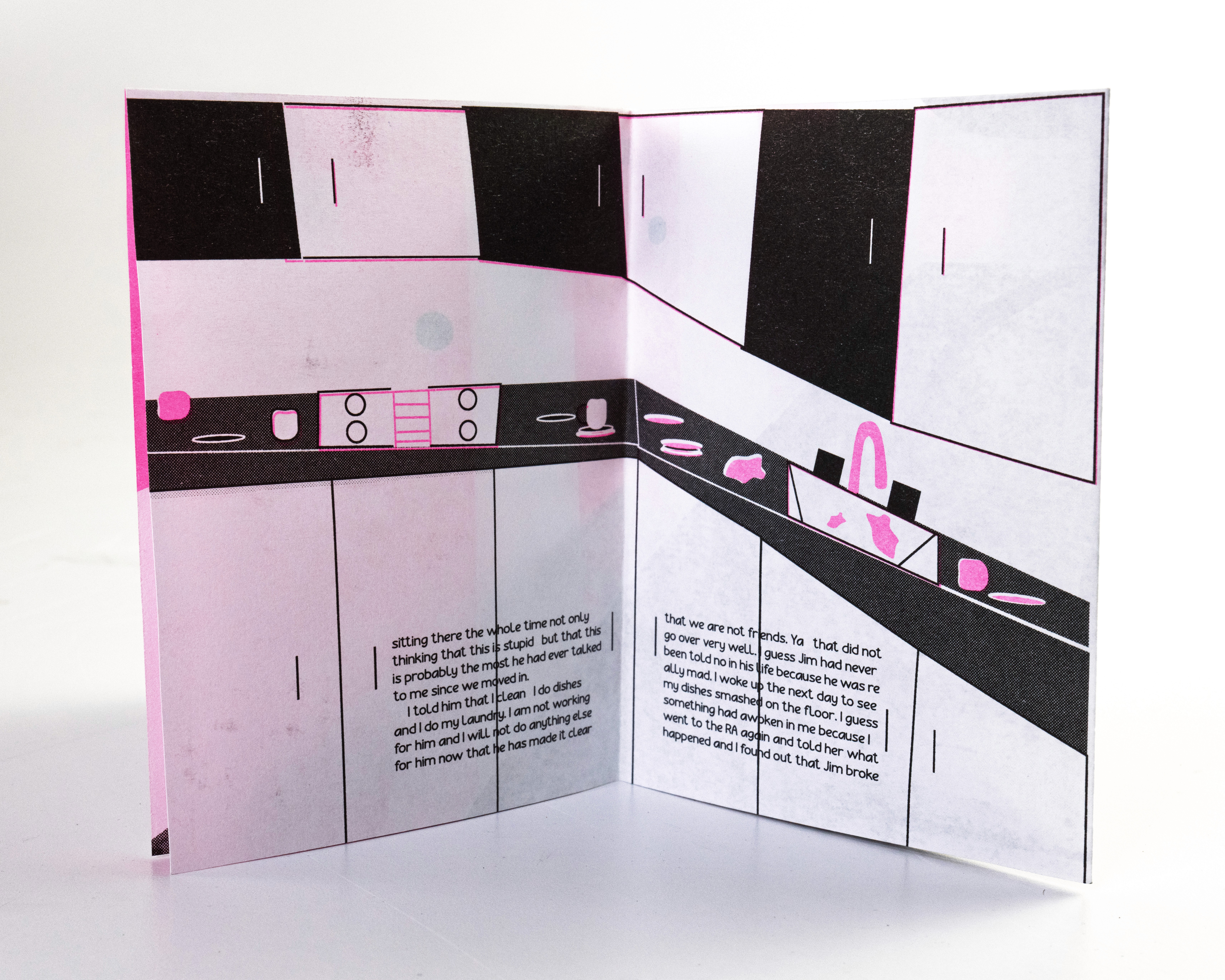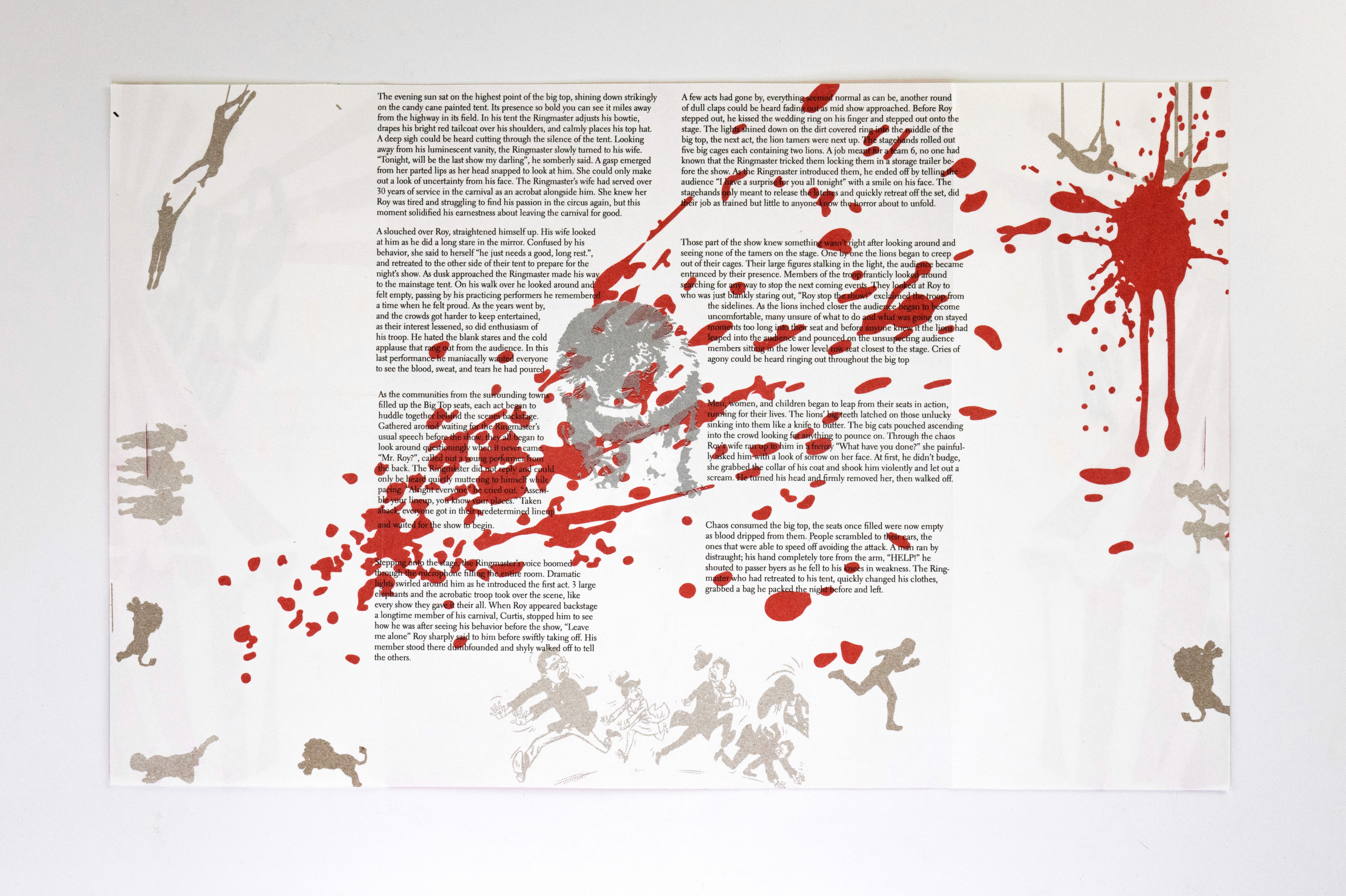 In this project students were prompted to write a thousand word narrative to design a composition from. This story could be fiction or a story from their life. They were given three additional conditions. One, they were only permitted a single sheet of tabloid paper. Two, the paper must be folded or cut in some way. And three, the final composition must be printed a RISO duplicator.