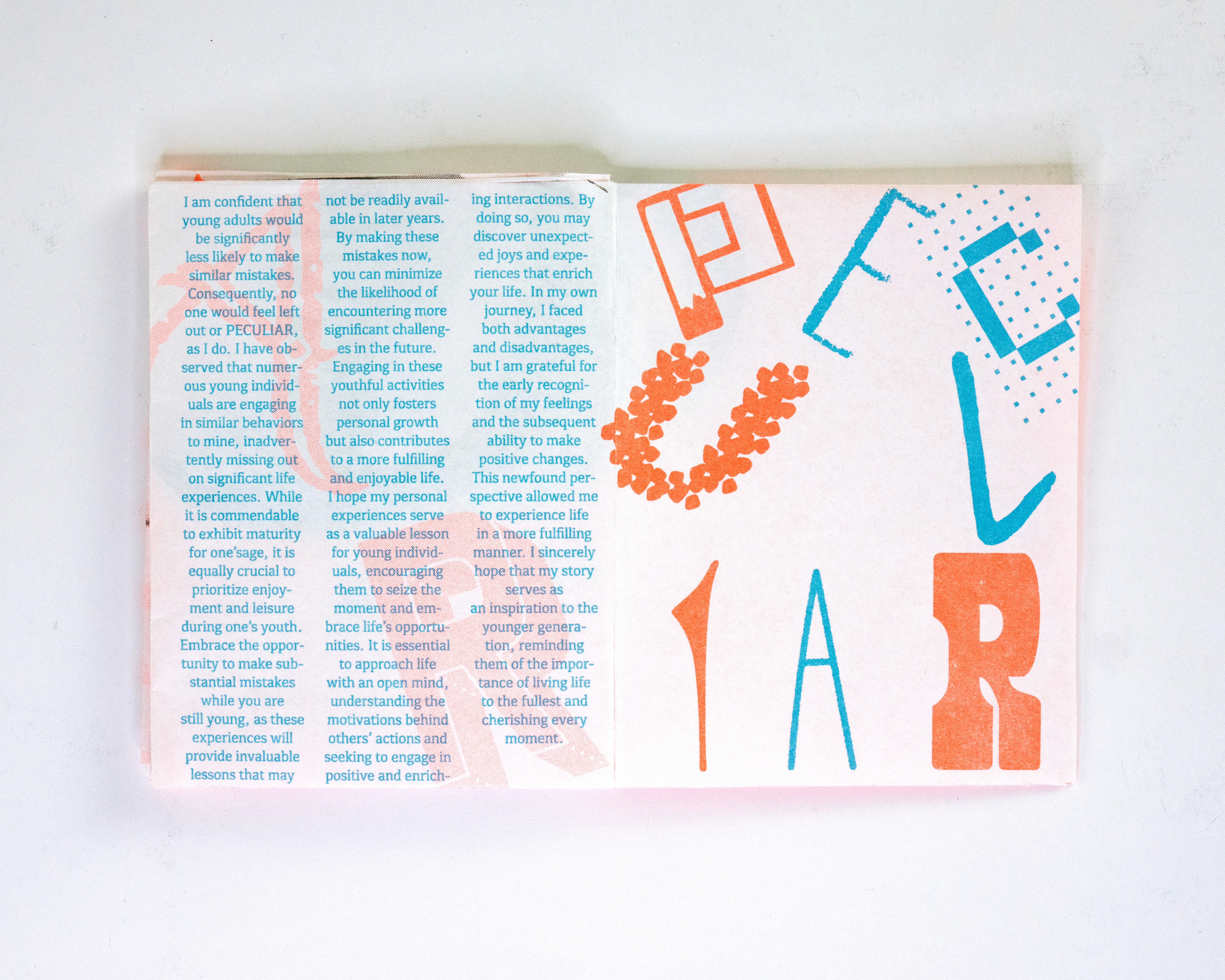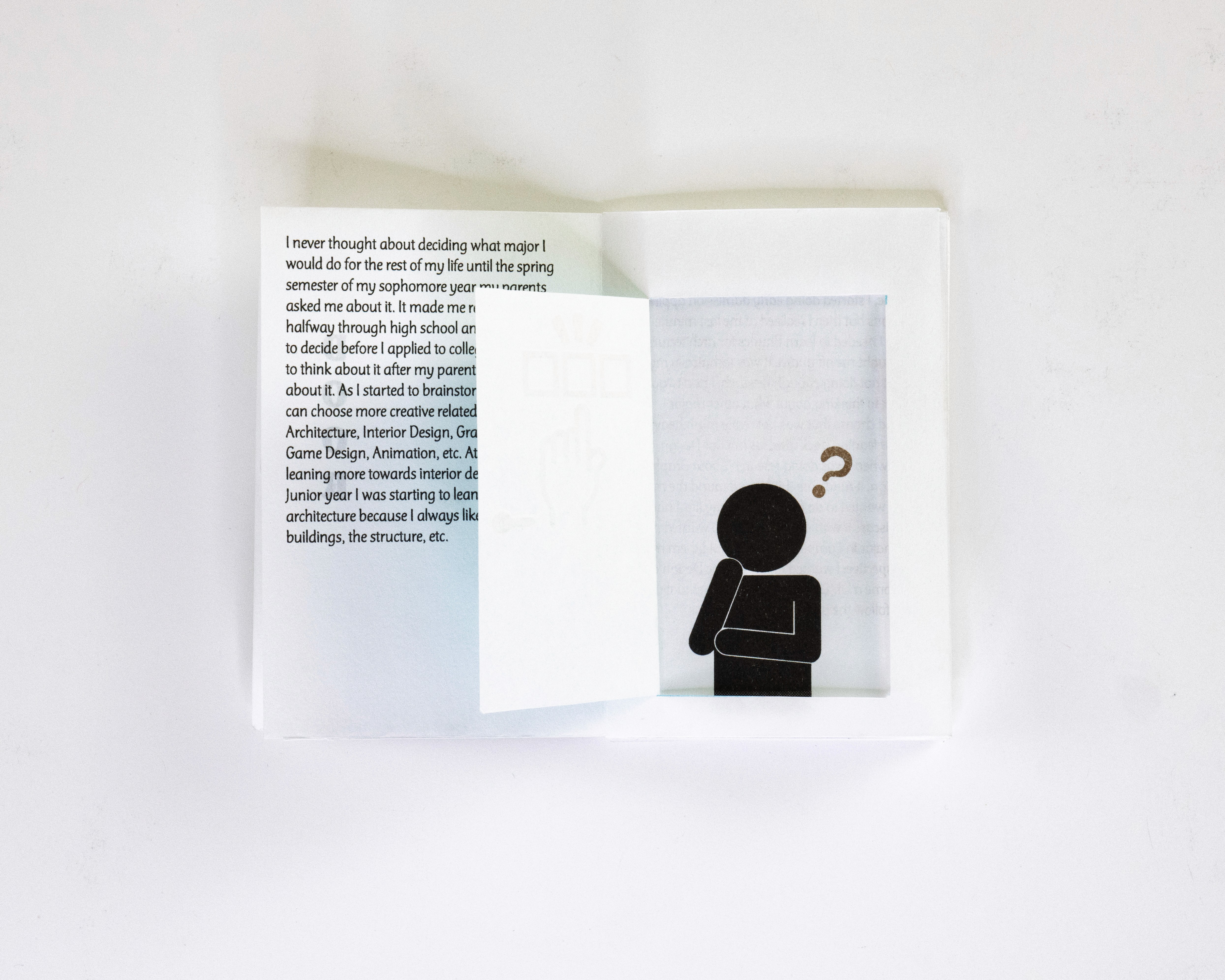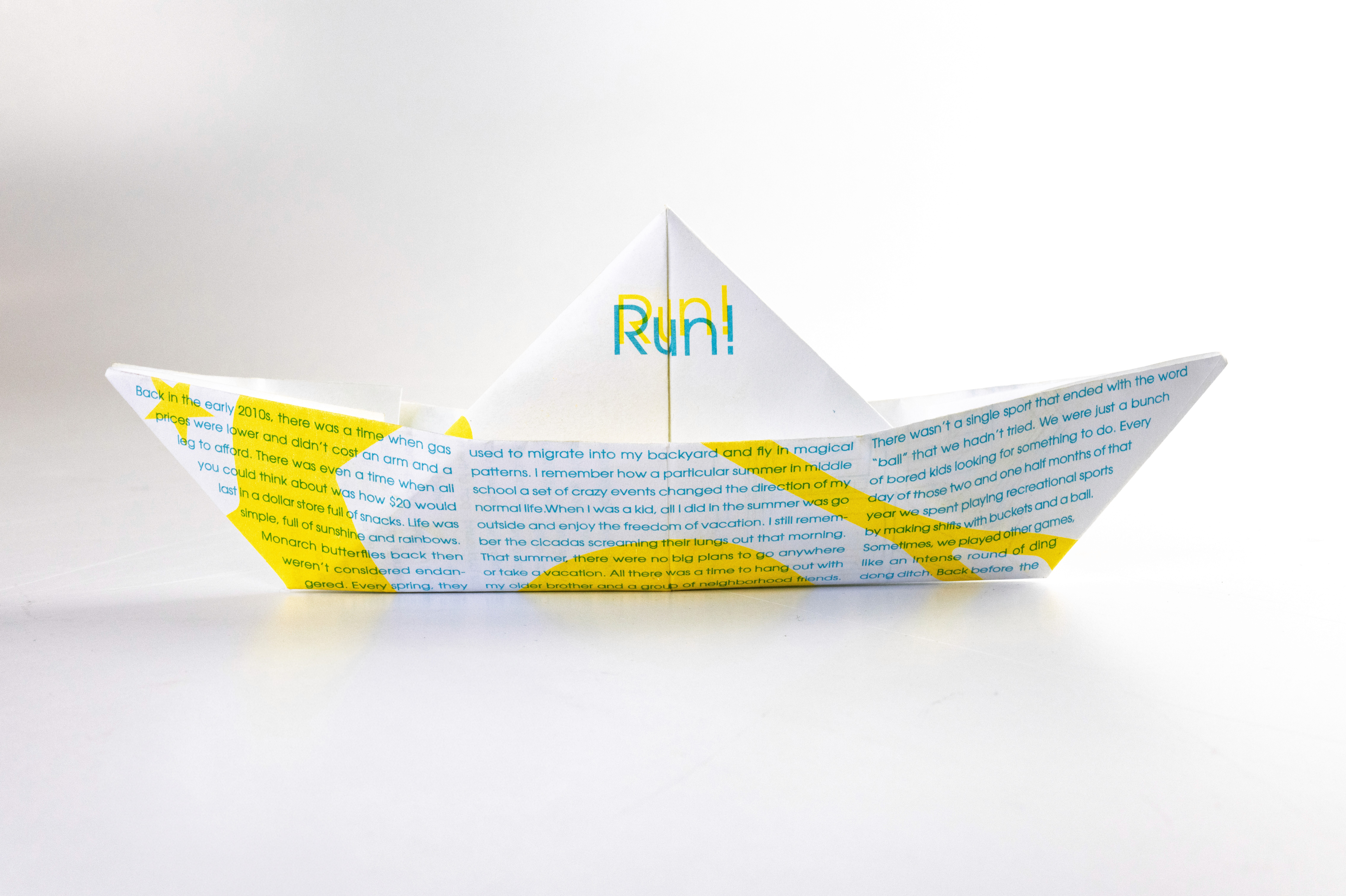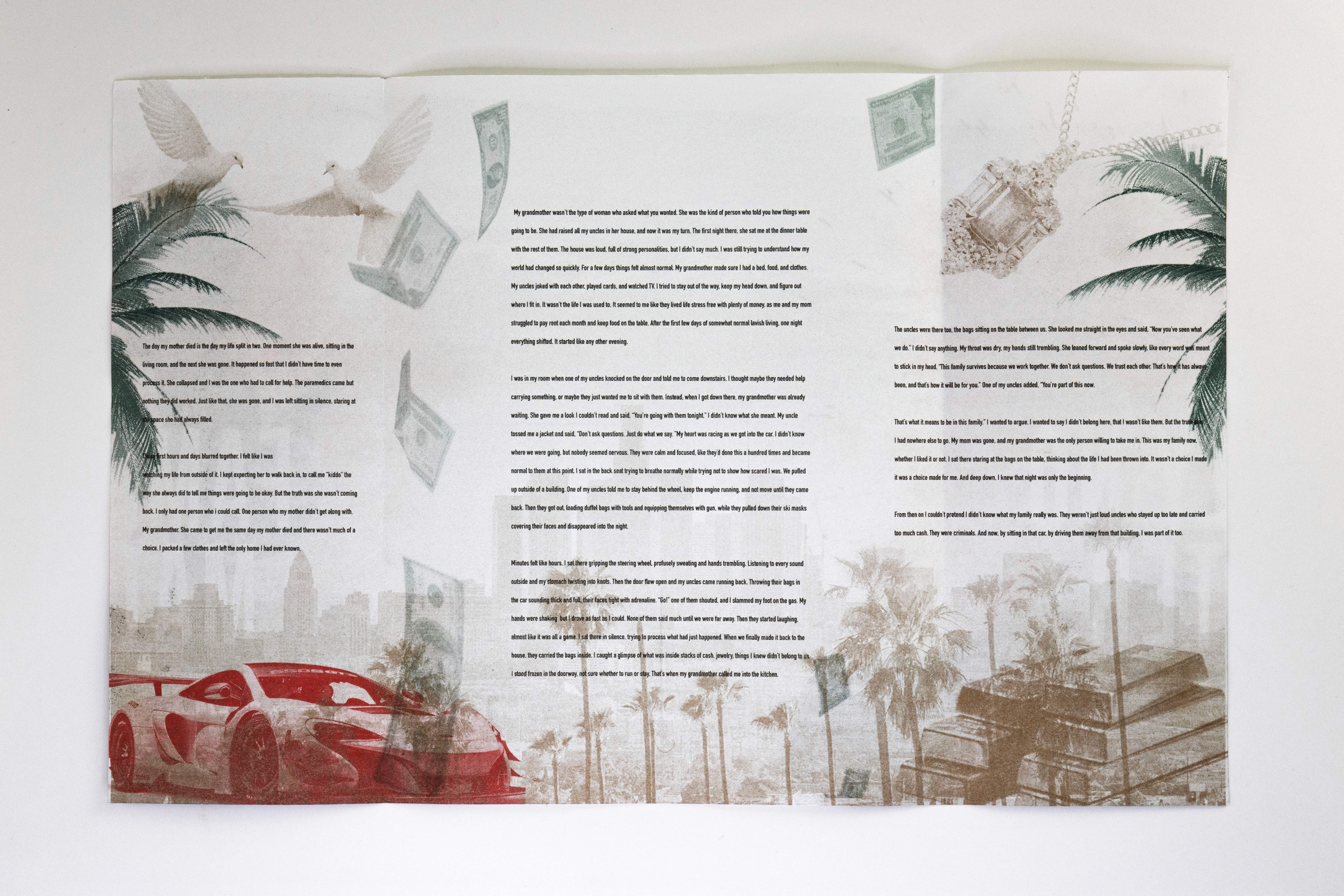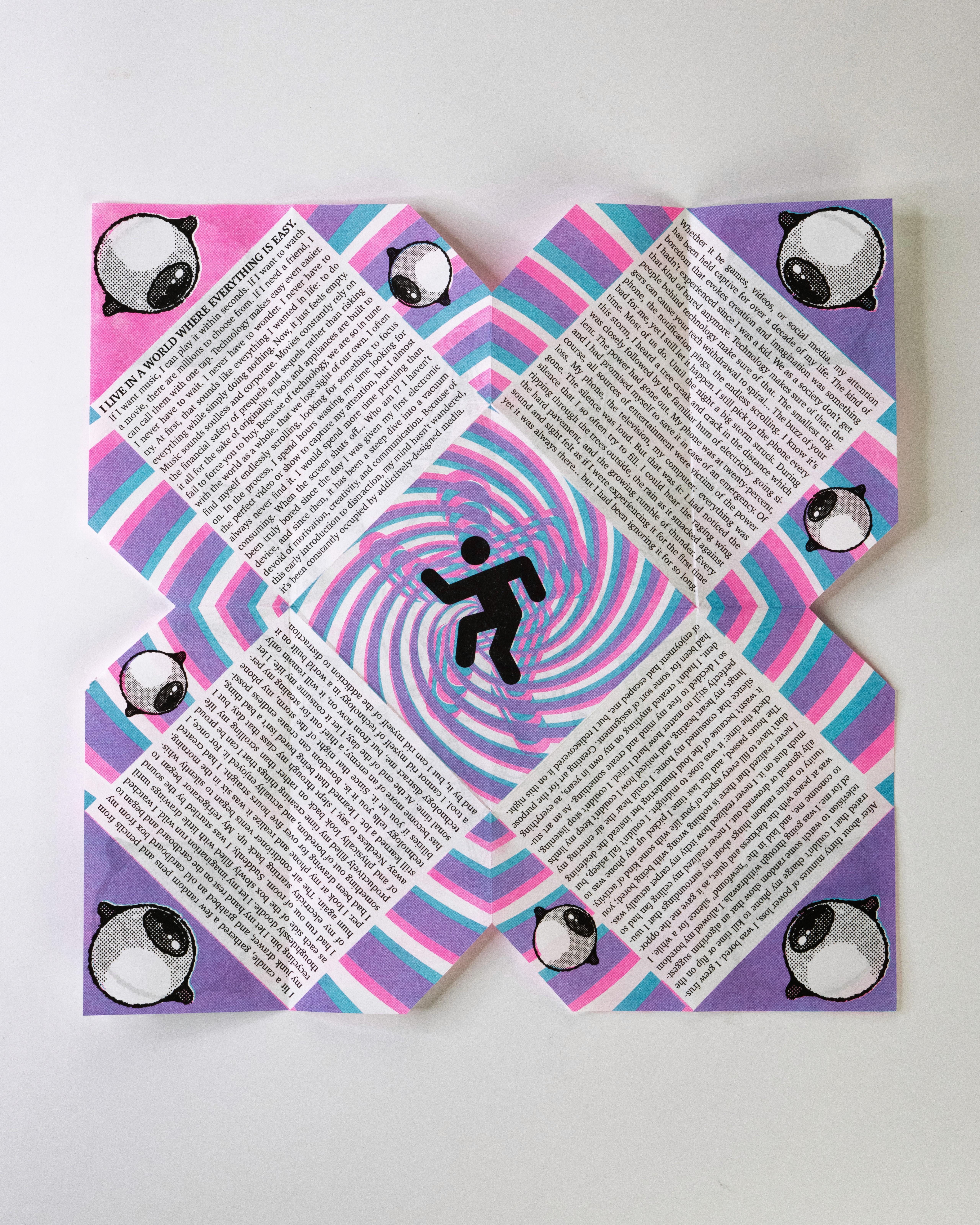 In this project students were prompted to write a thousand word narrative to design a composition from. This story could be fiction or a story from their life. They were given three additional conditions. One, they were only permitted a single sheet of tabloid paper. Two, the paper must be folded or cut in some way. And three, the final composition must be printed a RISO duplicator.