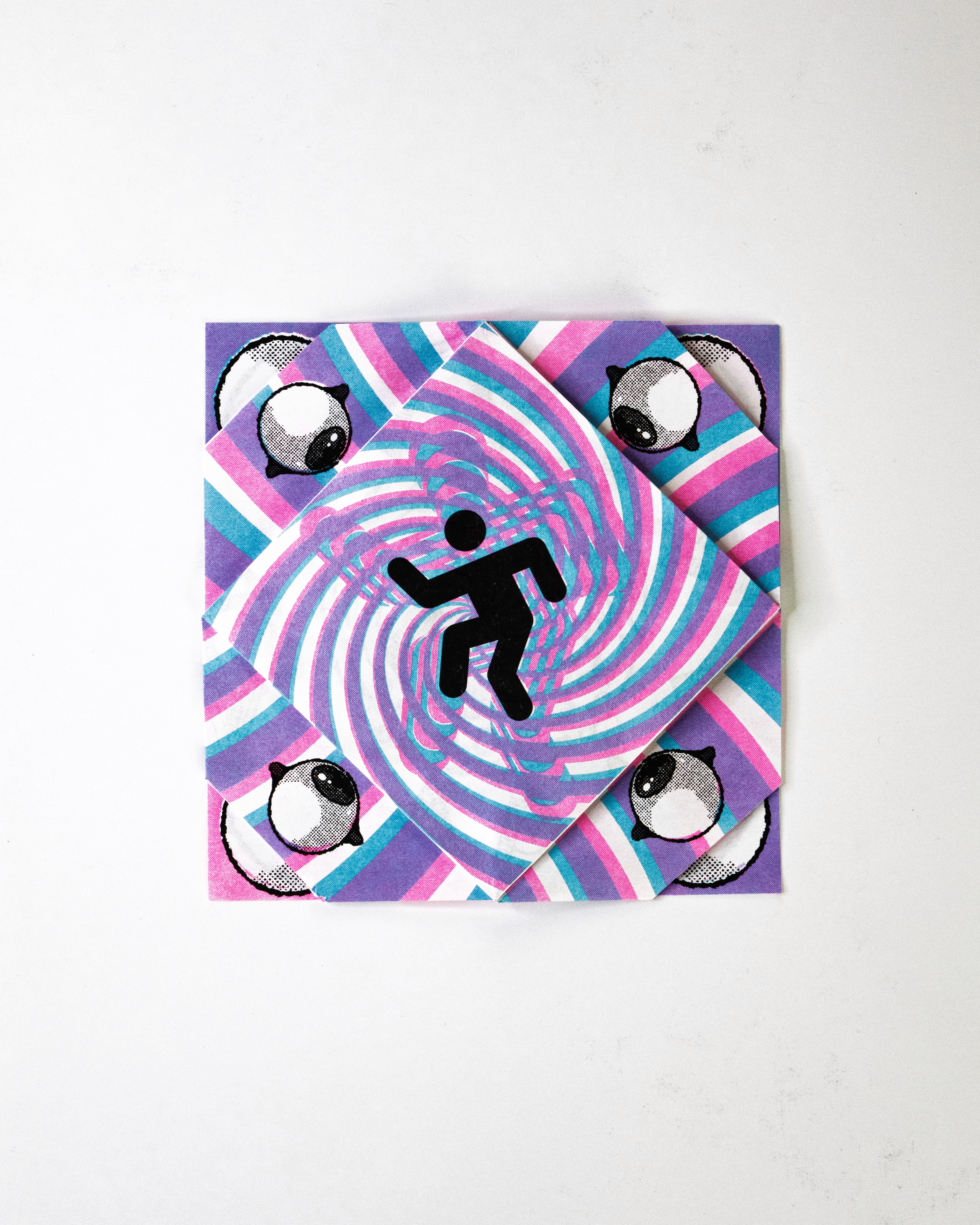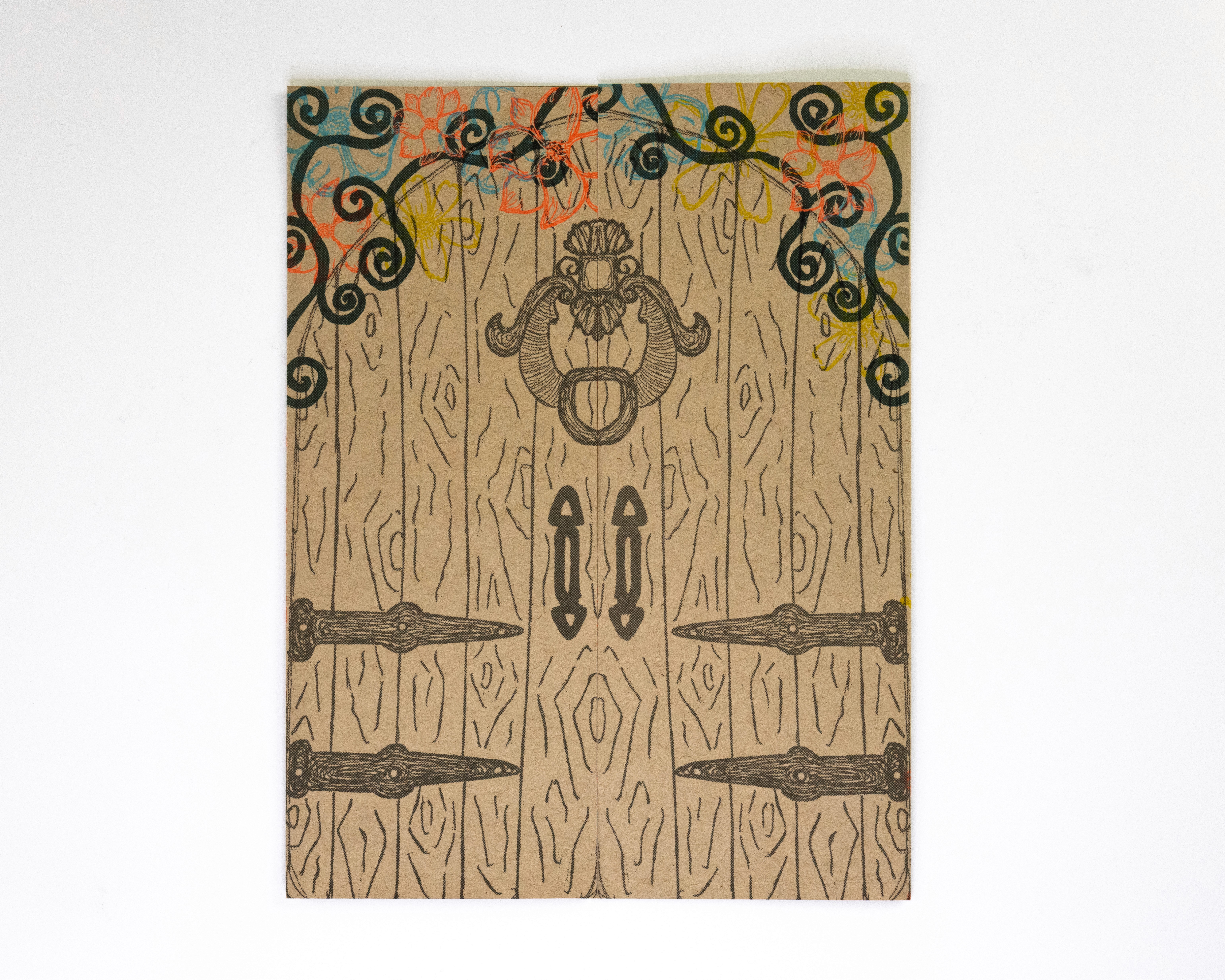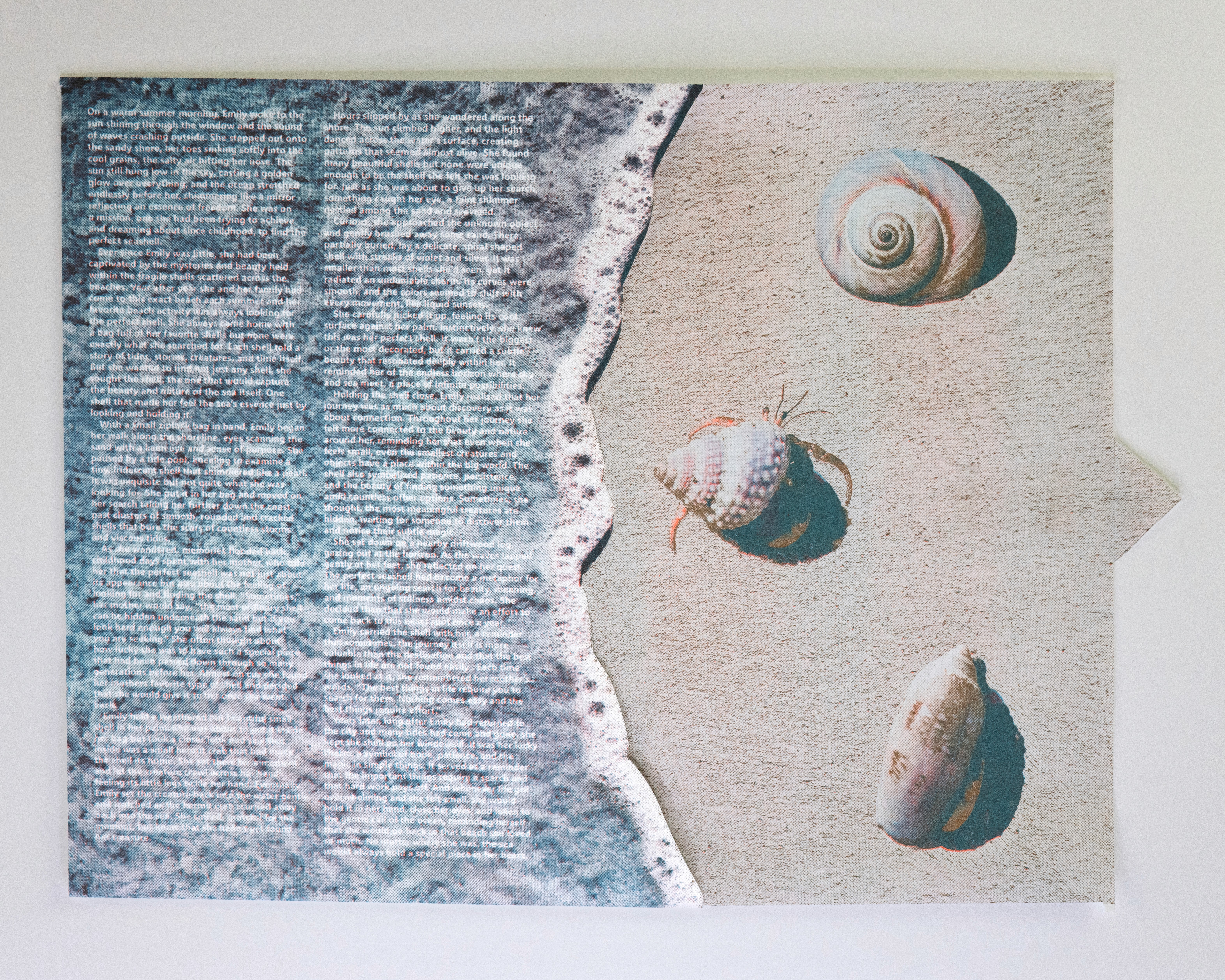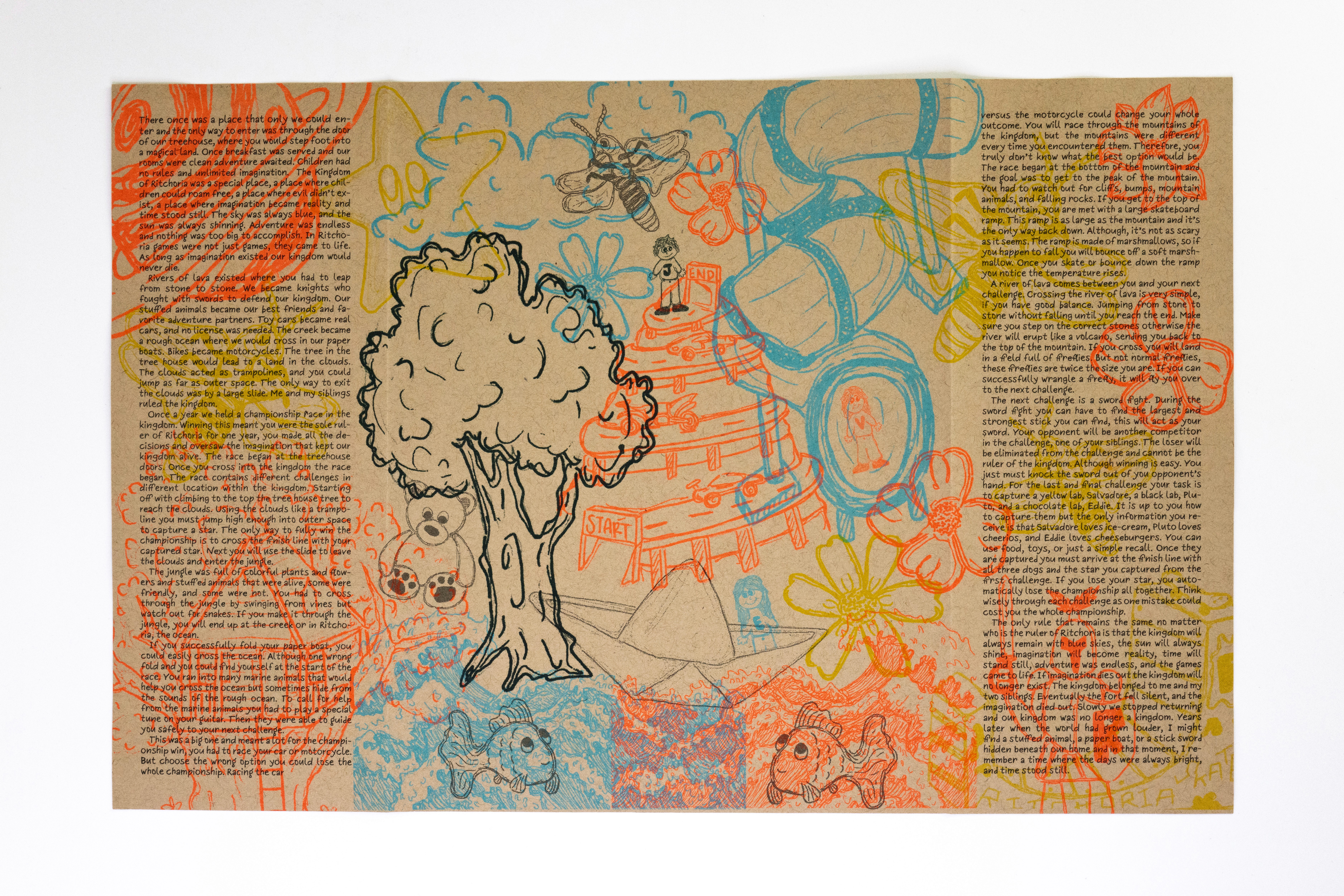 In this project students were prompted to write a thousand word narrative to design a composition from. This story could be fiction or a story from their life. They were given three additional conditions. One, they were only permitted a single sheet of tabloid paper. Two, the paper must be folded or cut in some way. And three, the final composition must be printed a RISO duplicator.