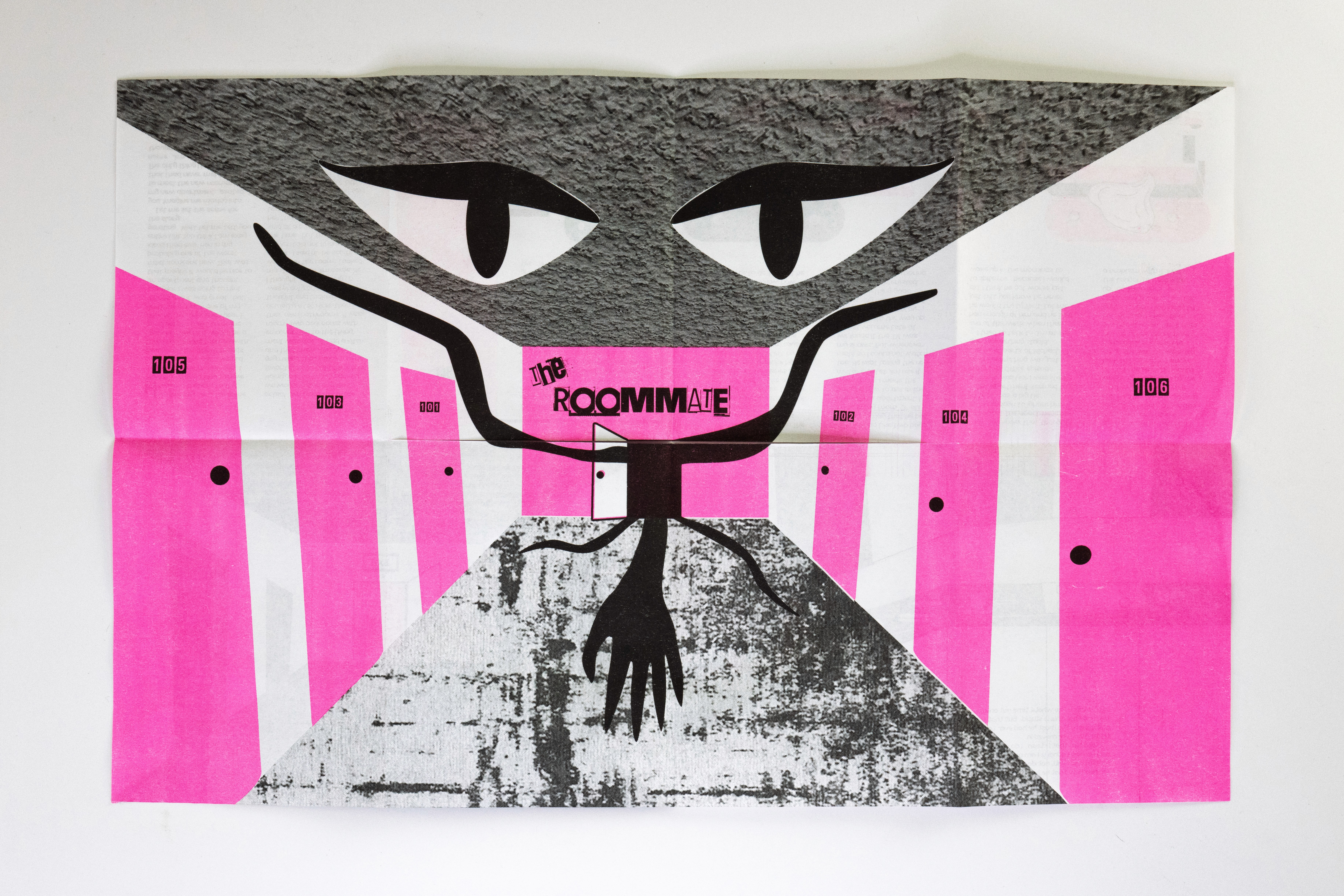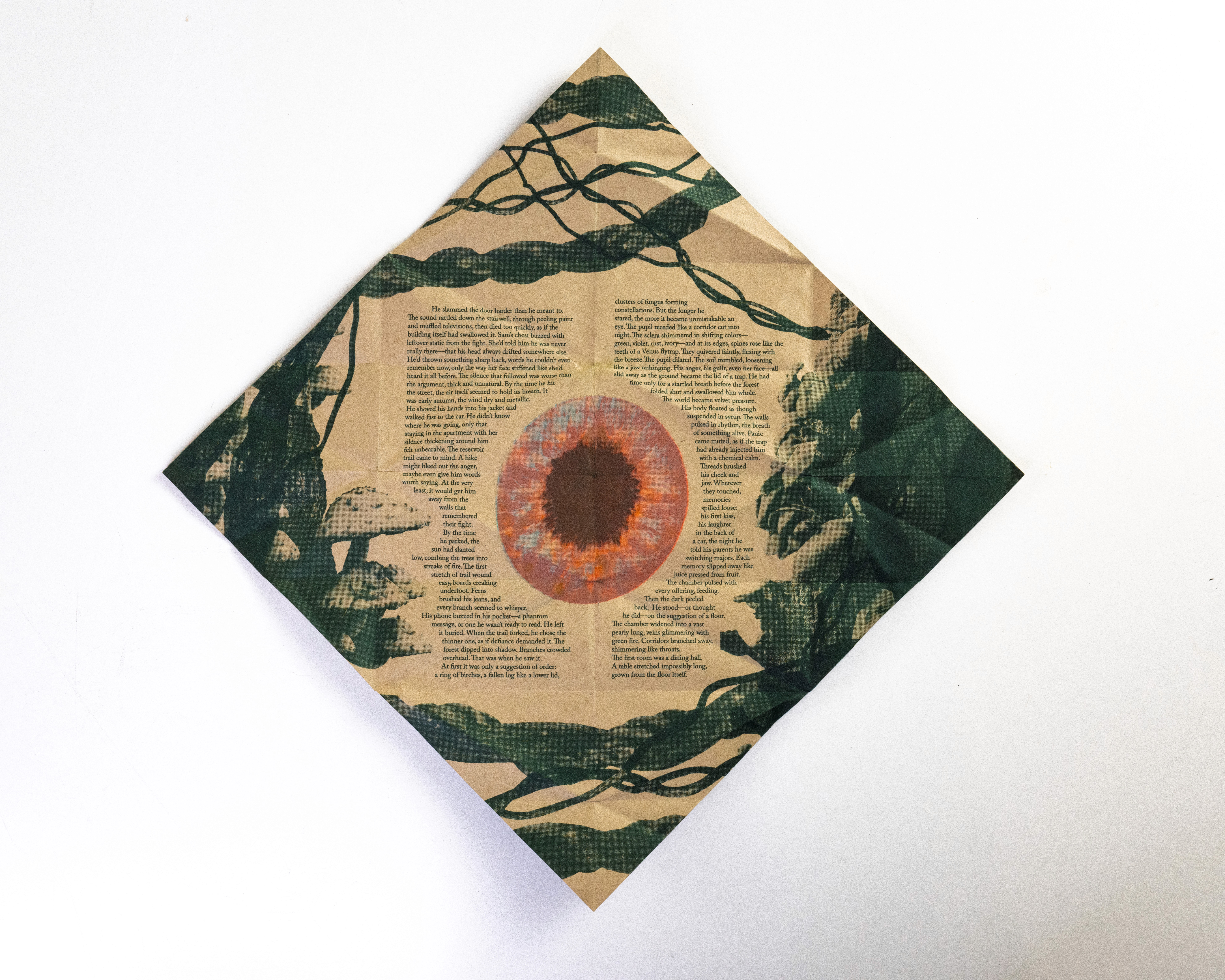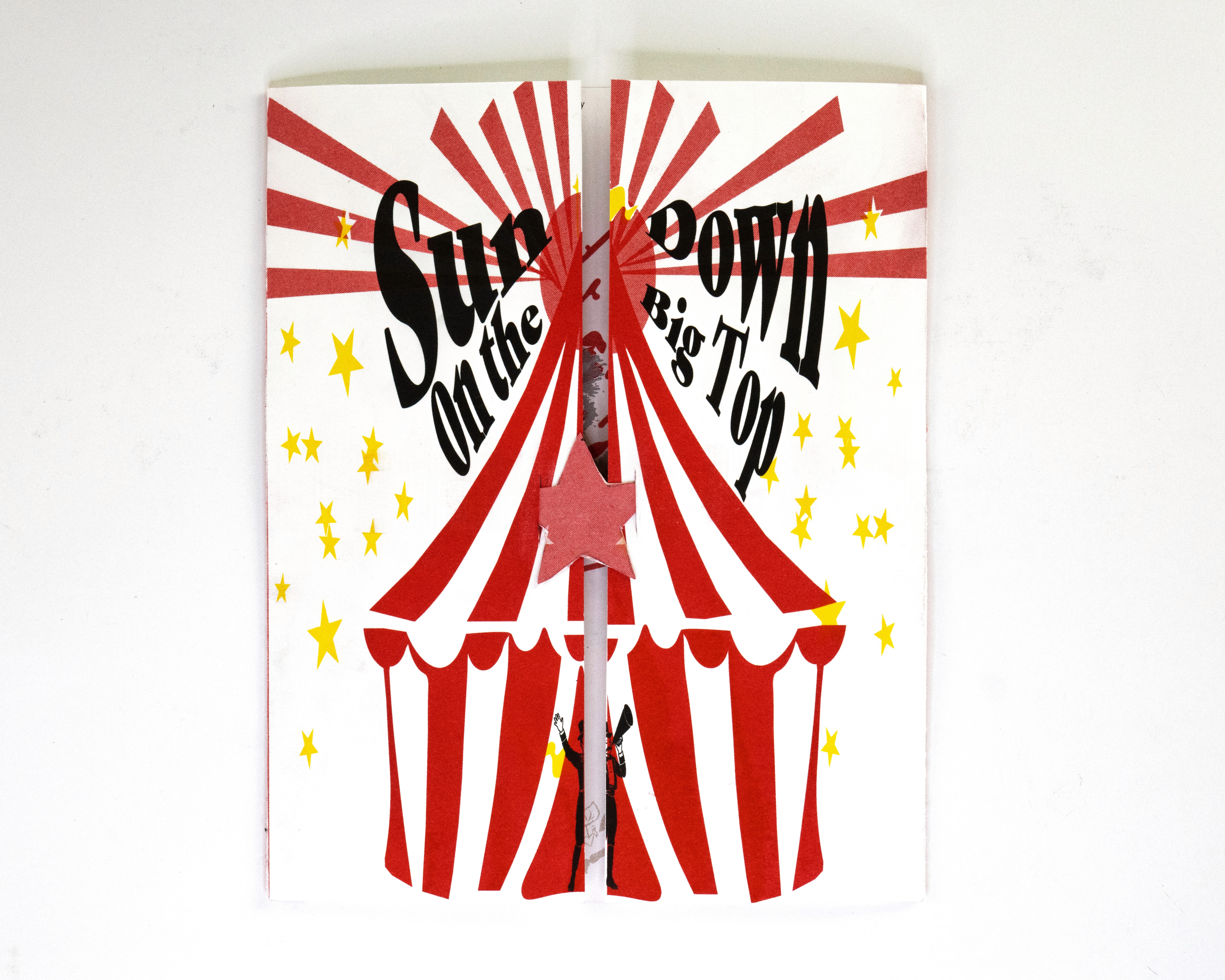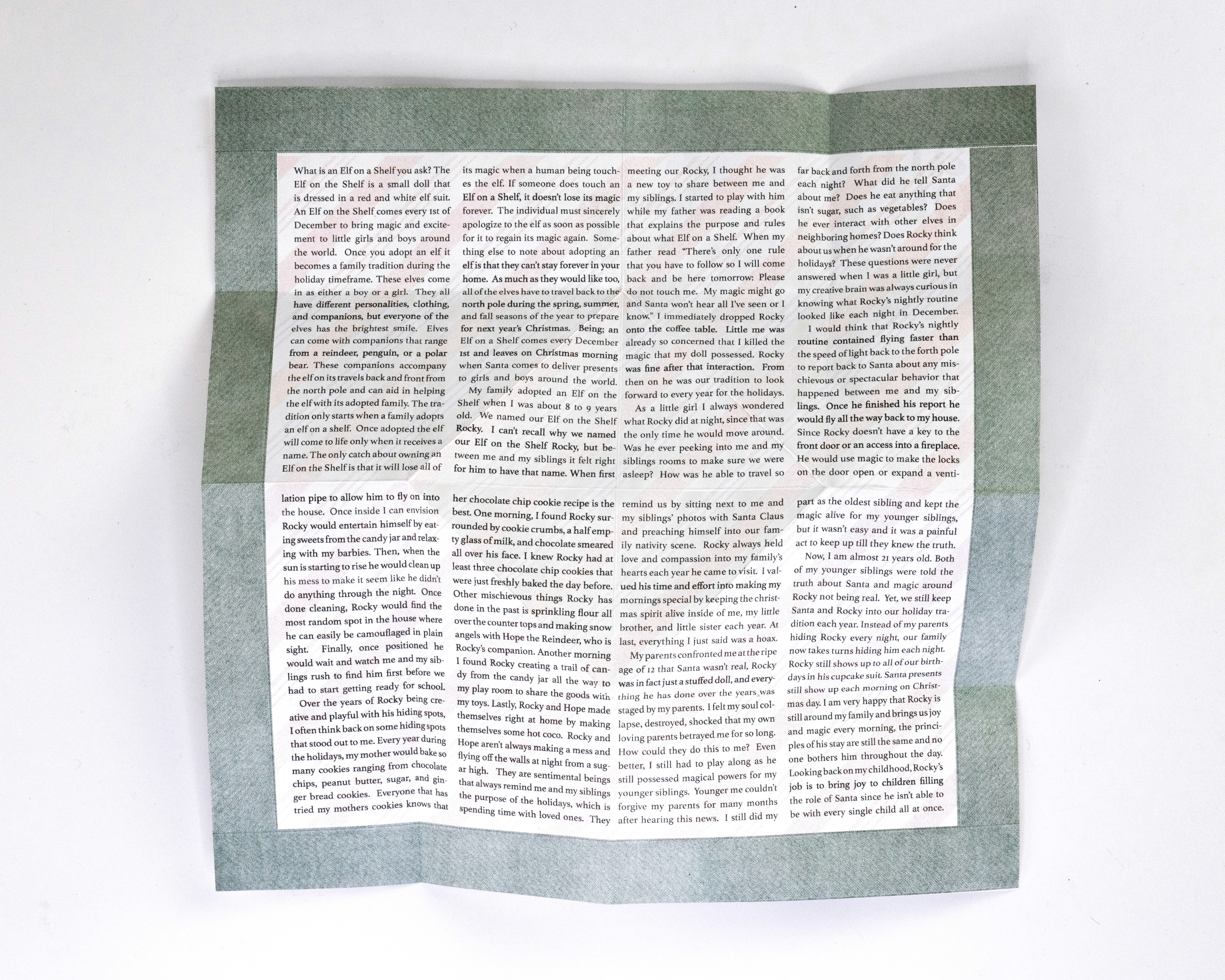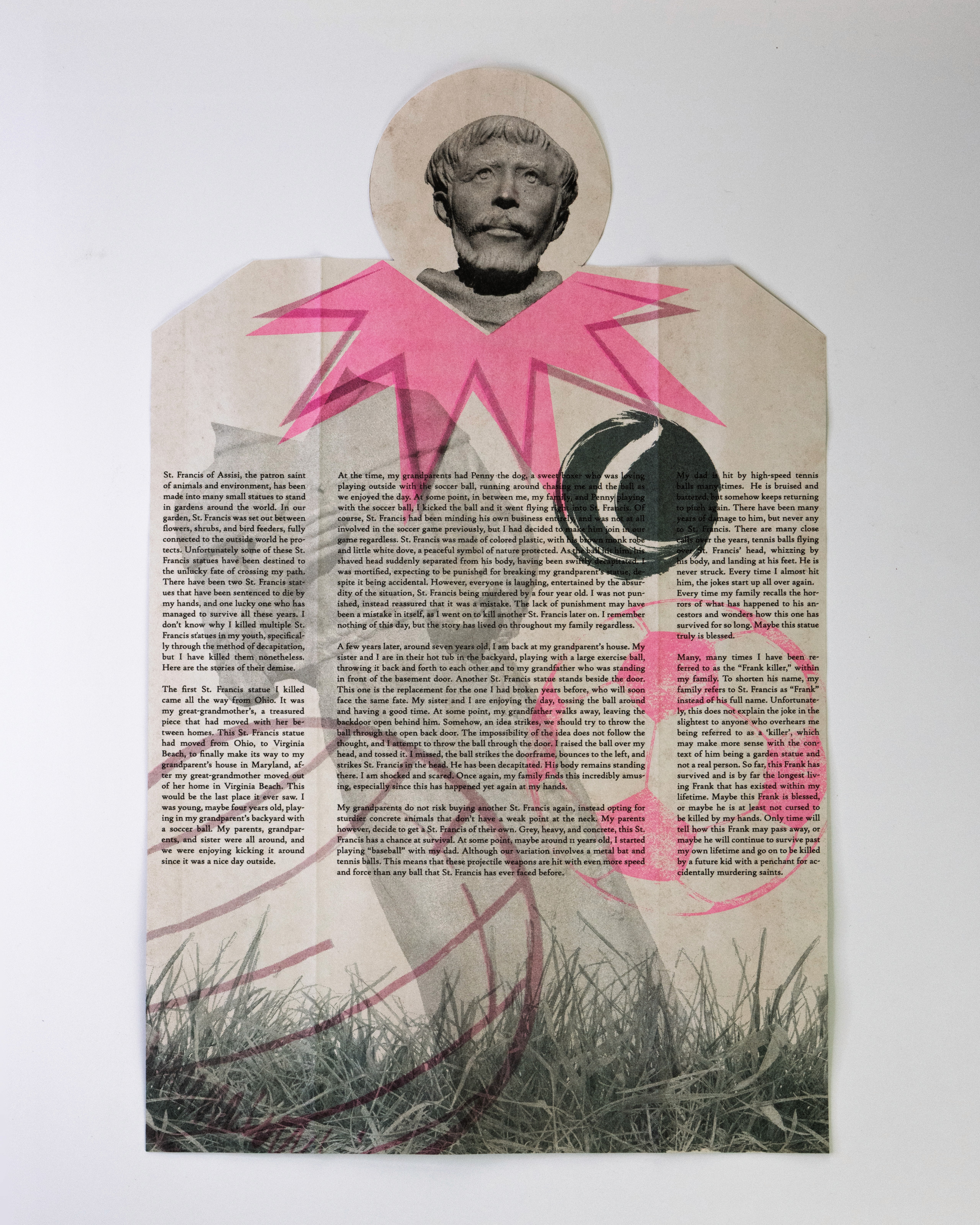 In this project students were prompted to write a thousand word narrative to design a composition from. This story could be fiction or a story from their life. They were given three additional conditions. One, they were only permitted a single sheet of tabloid paper. Two, the paper must be folded or cut in some way. And three, the final composition must be printed a RISO duplicator.