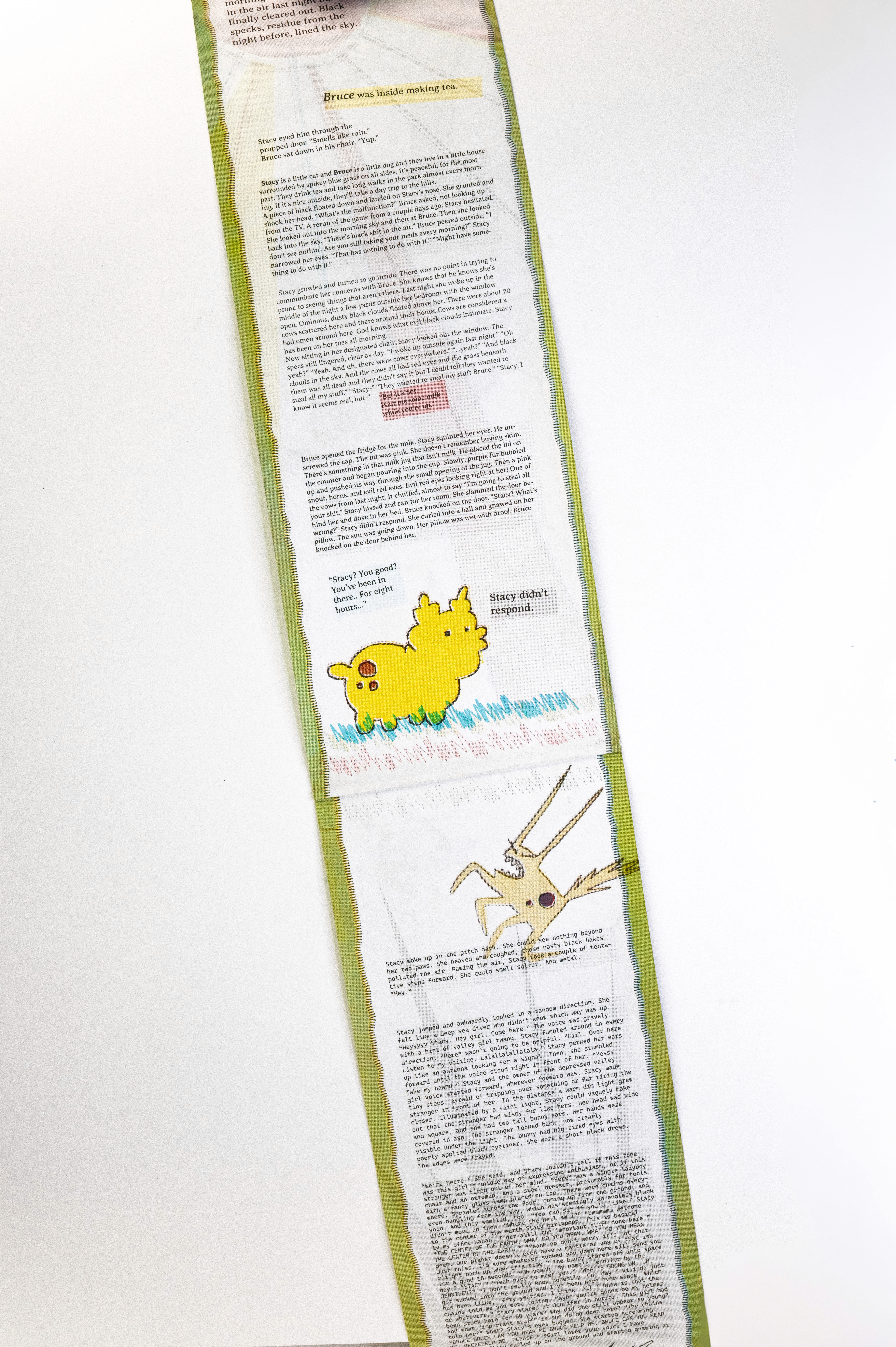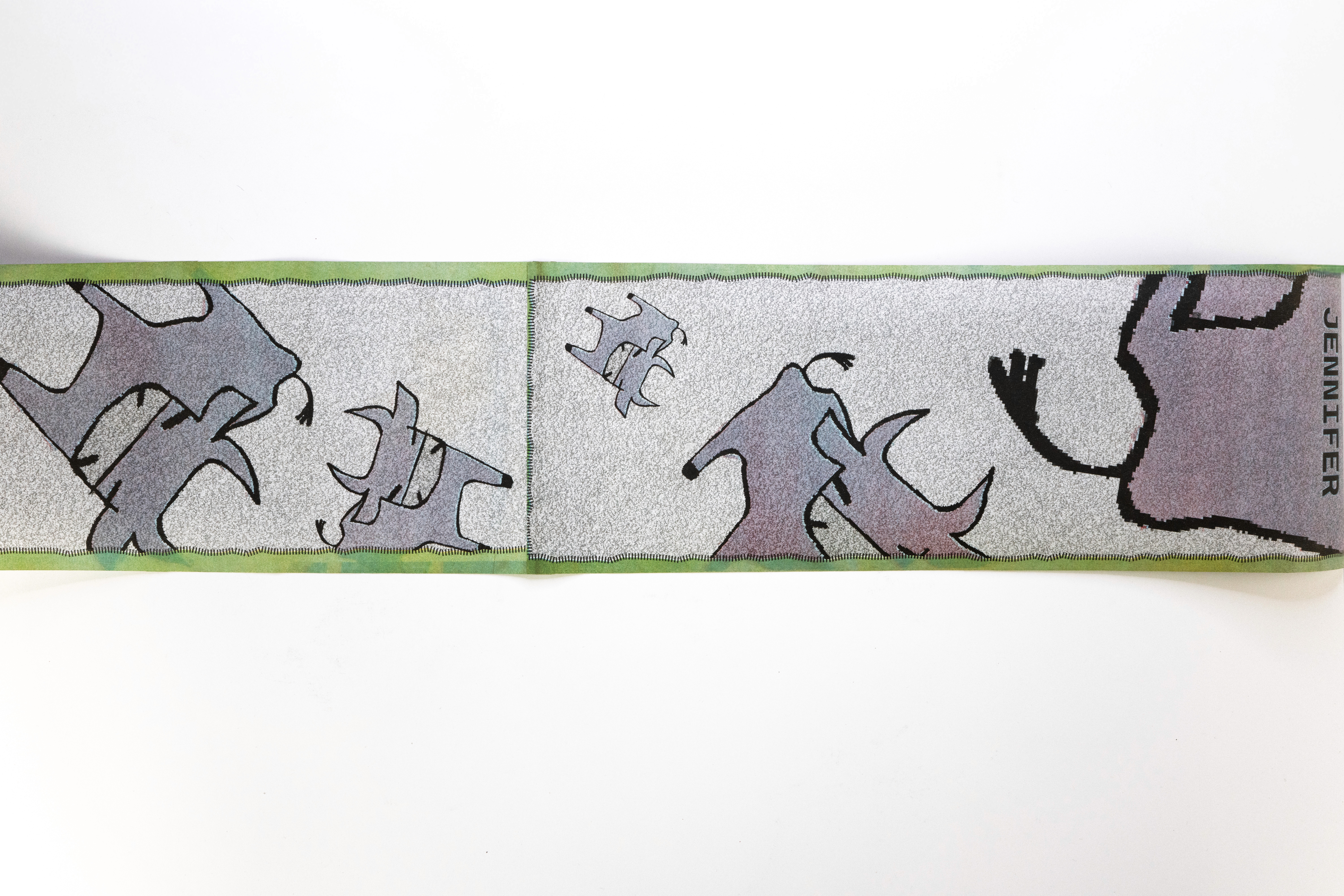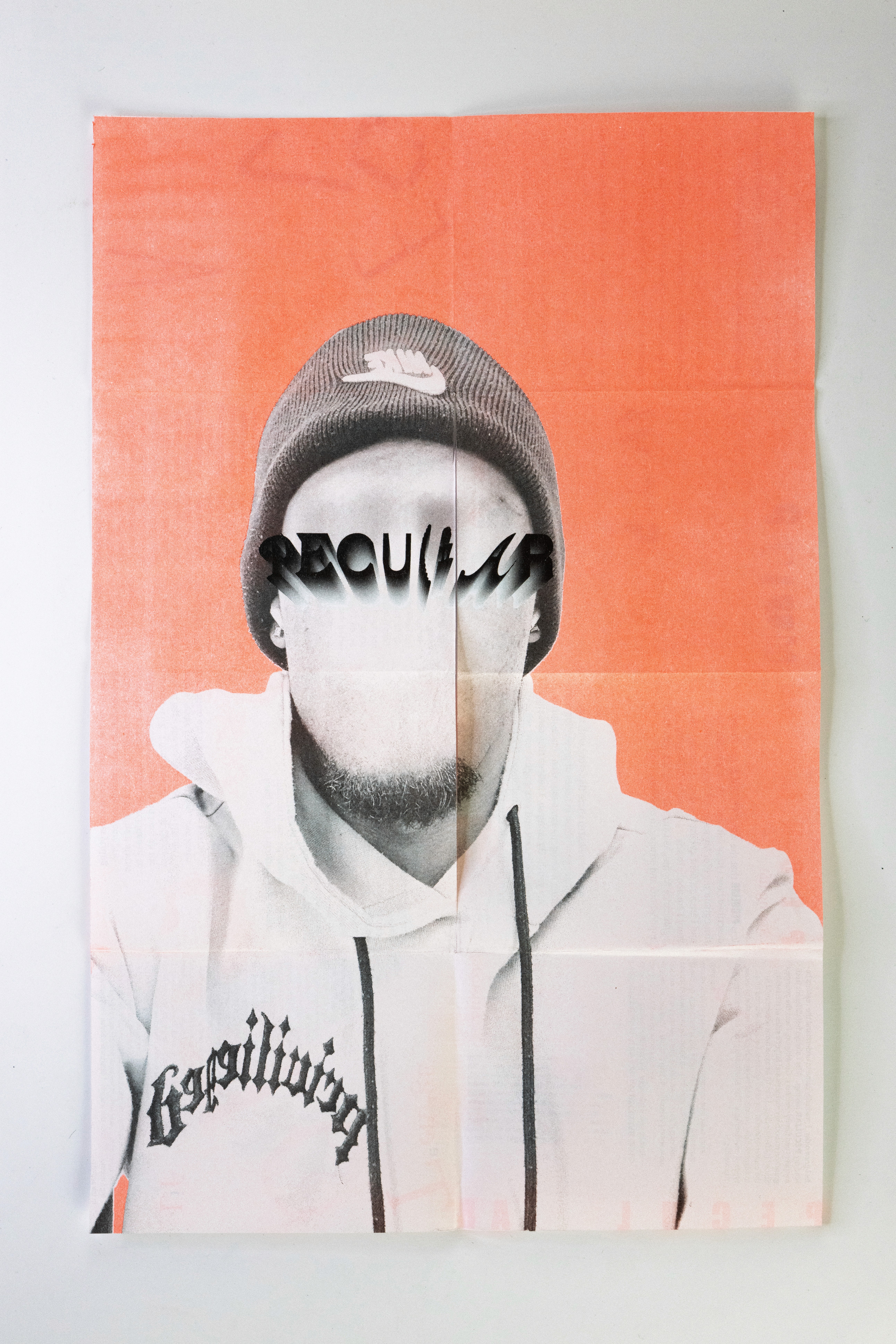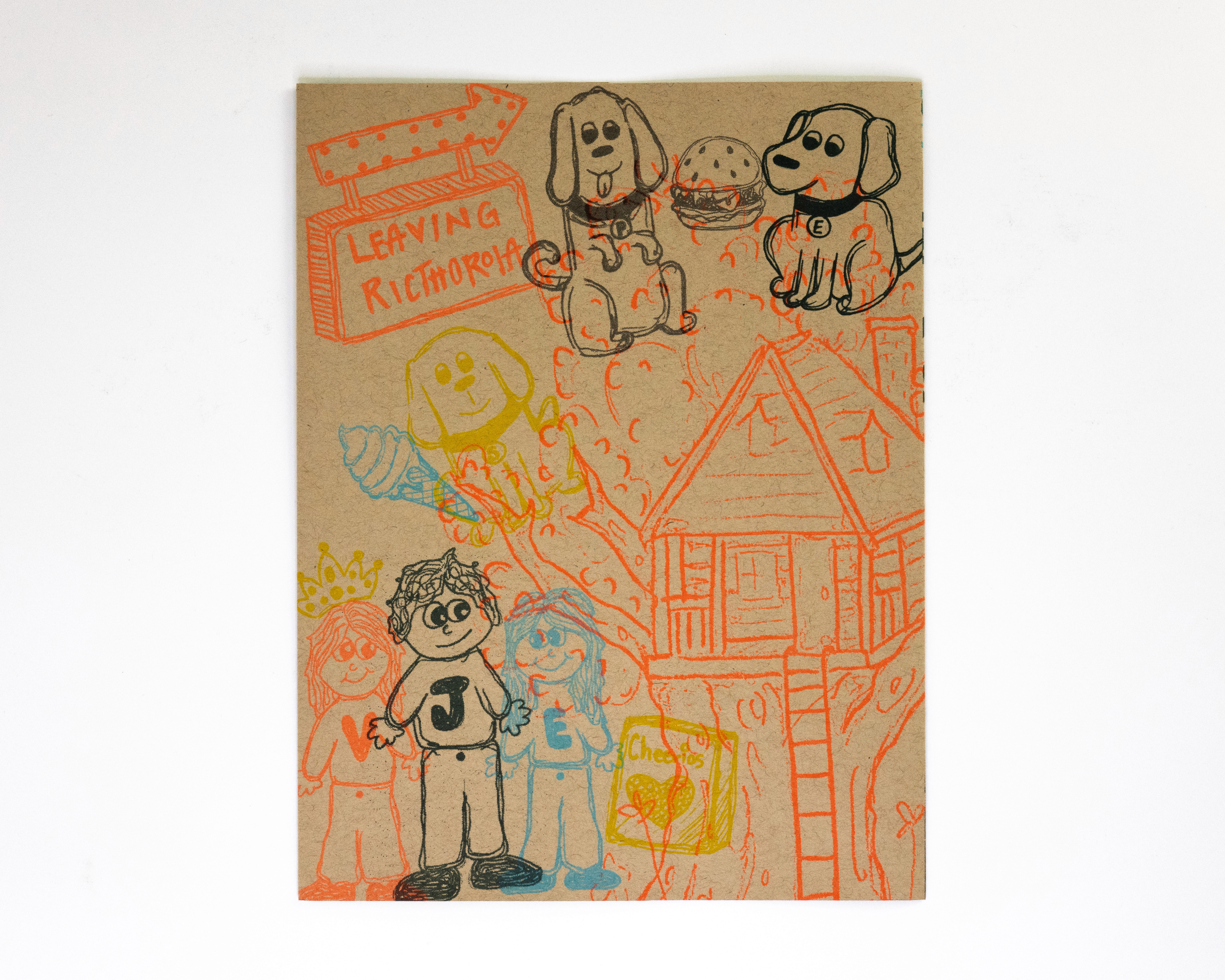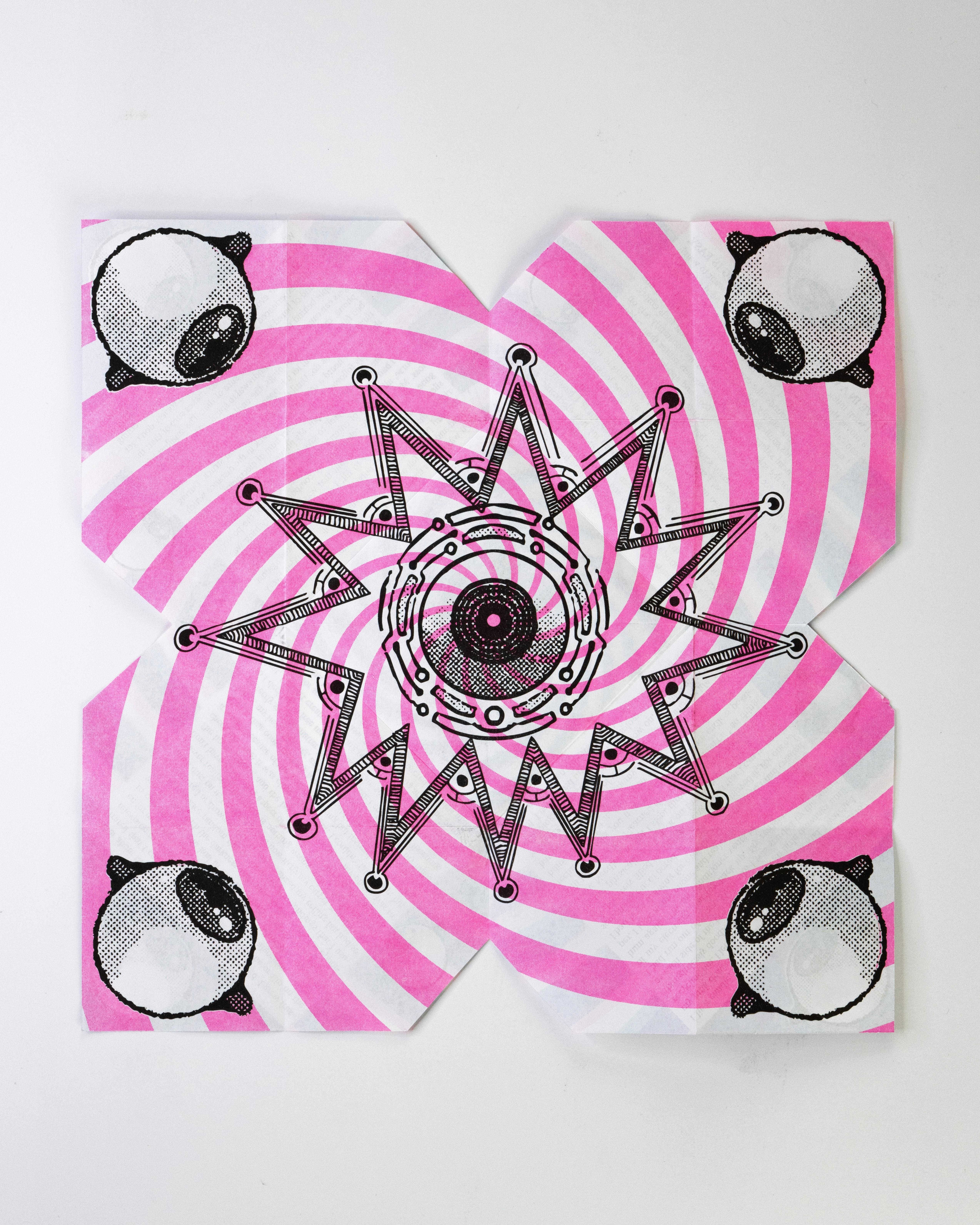 In this project students were prompted to write a thousand word narrative to design a composition from. This story could be fiction or a story from their life. They were given three additional conditions. One, they were only permitted a single sheet of tabloid paper. Two, the paper must be folded or cut in some way. And three, the final composition must be printed a RISO duplicator.