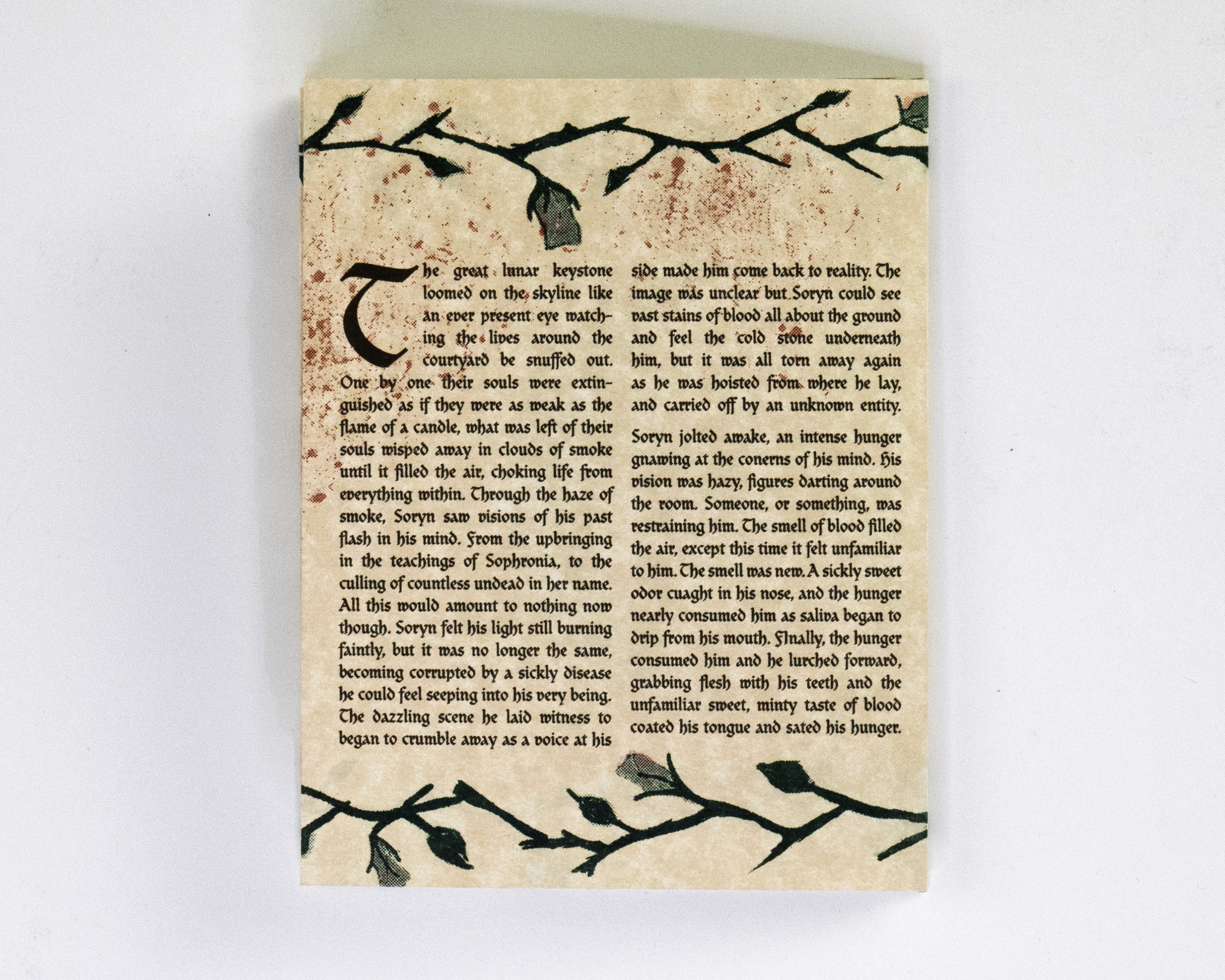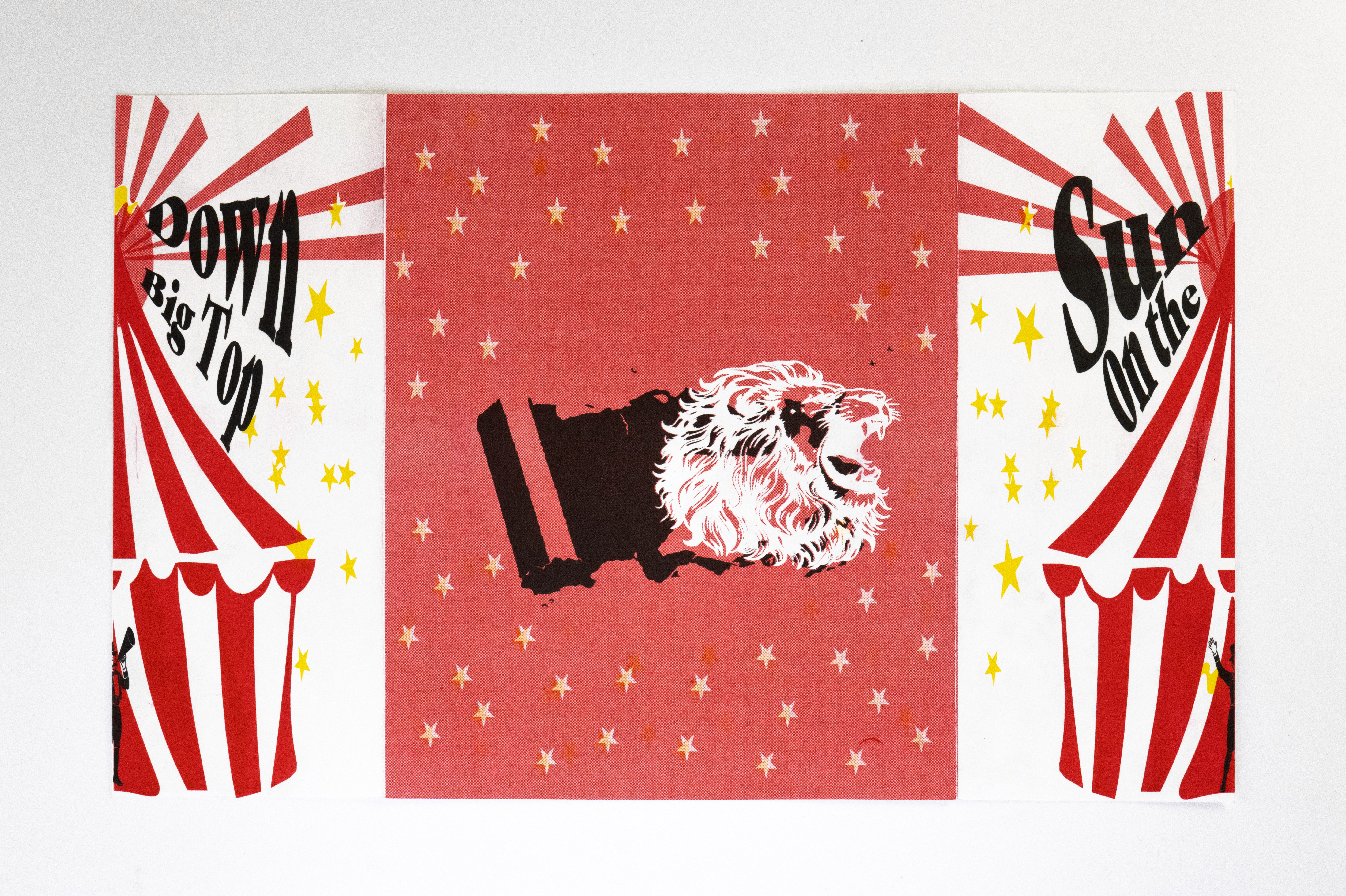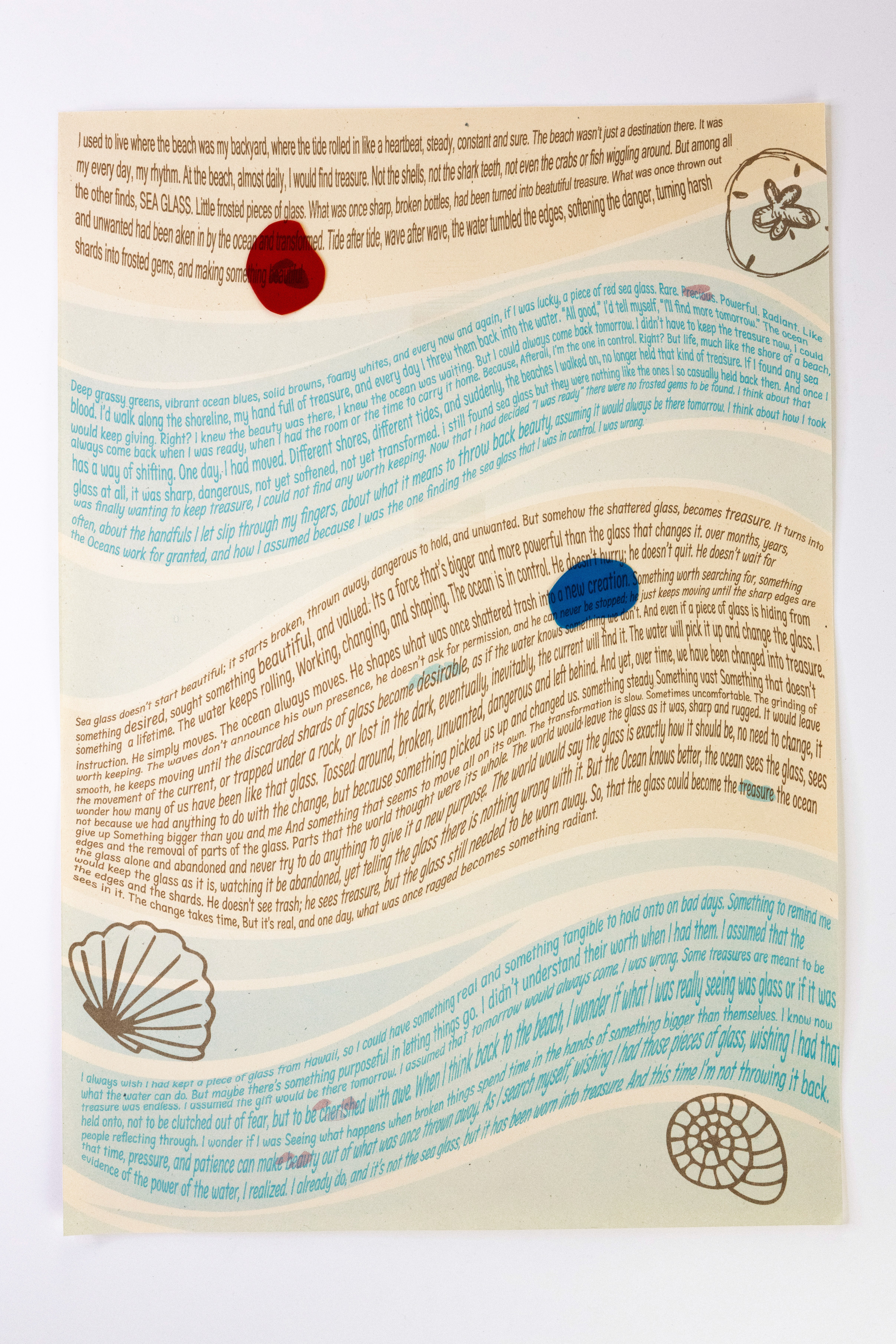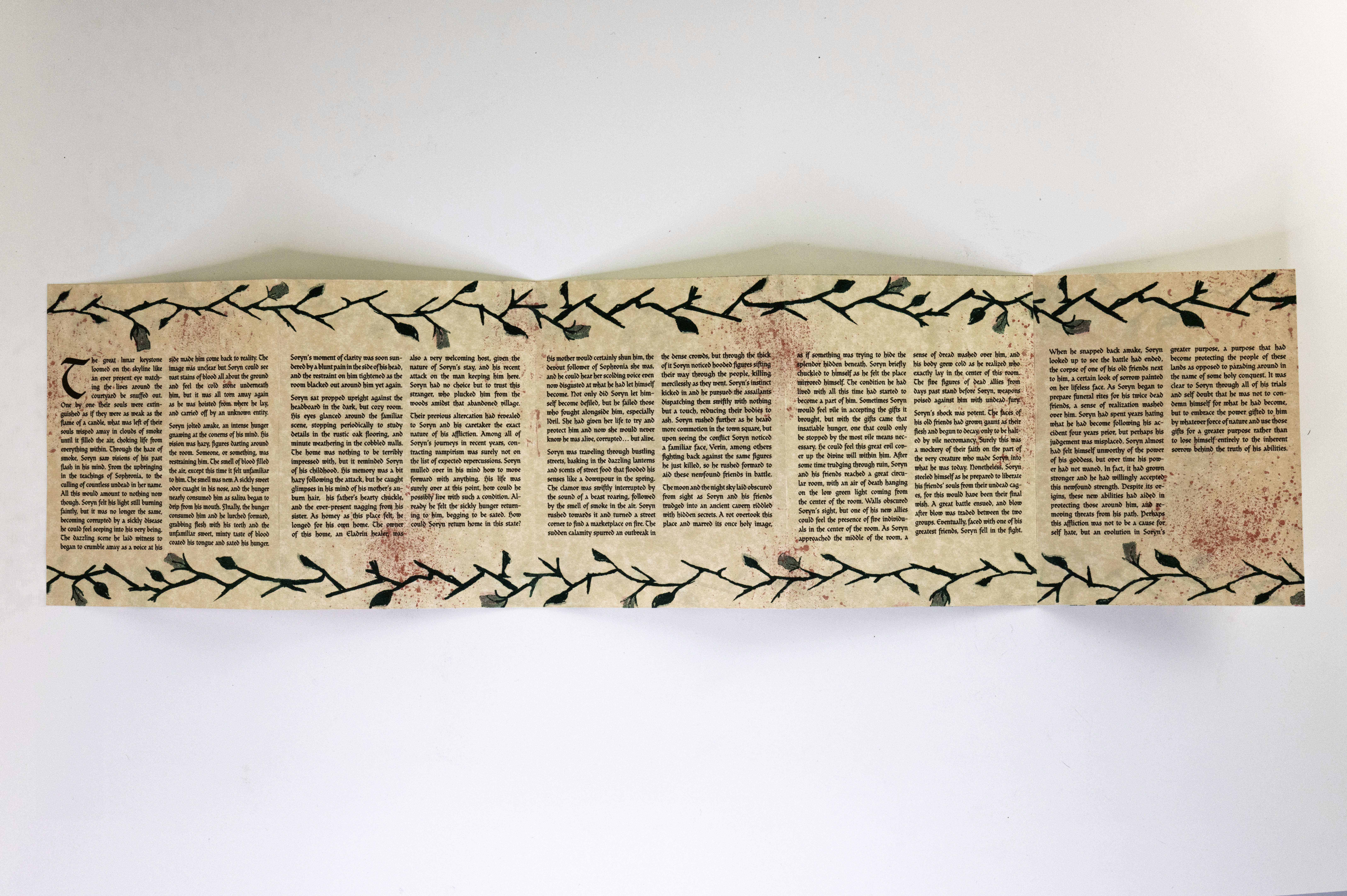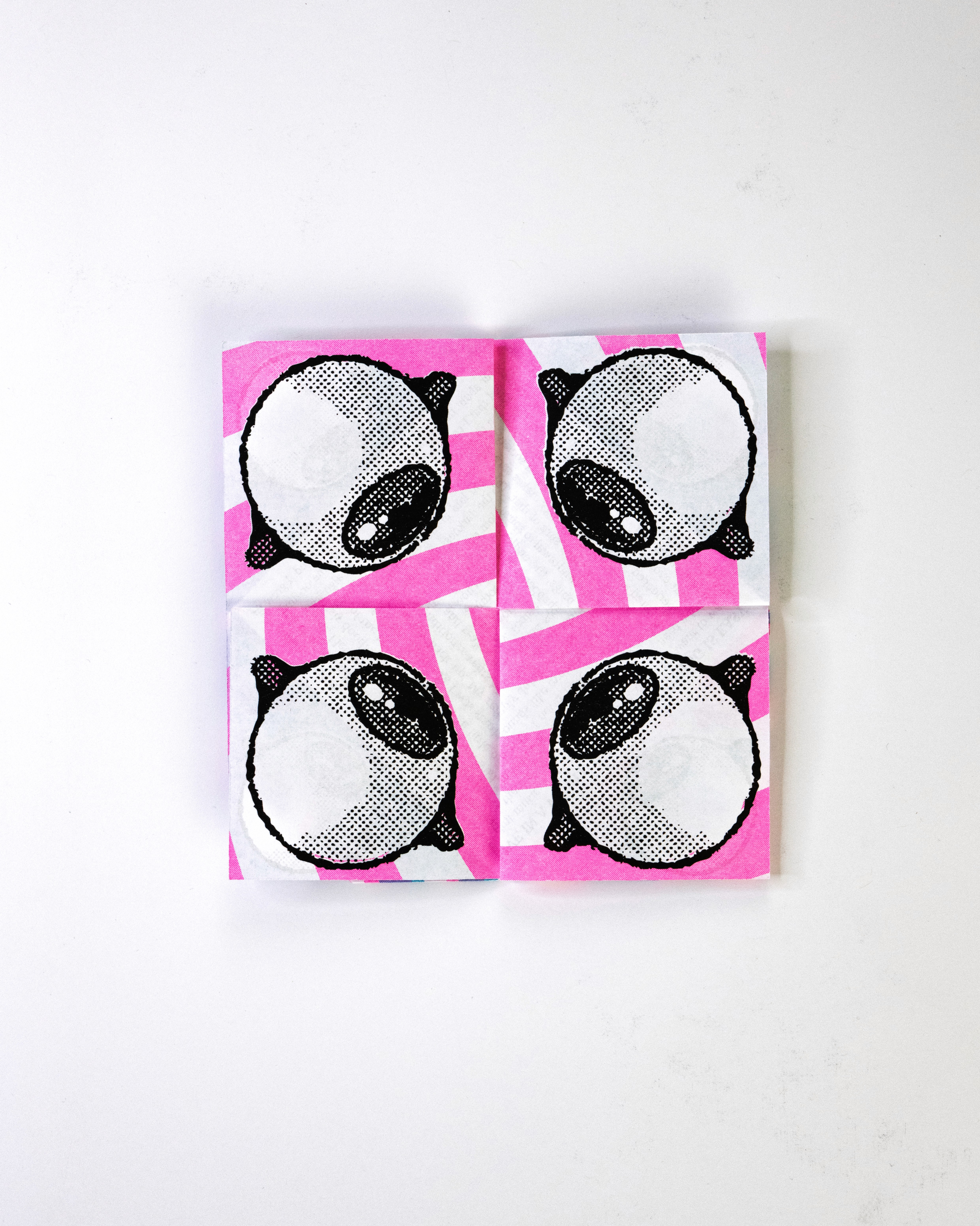 In this project students were prompted to write a thousand word narrative to design a composition from. This story could be fiction or a story from their life. They were given three additional conditions. One, they were only permitted a single sheet of tabloid paper. Two, the paper must be folded or cut in some way. And three, the final composition must be printed a RISO duplicator.