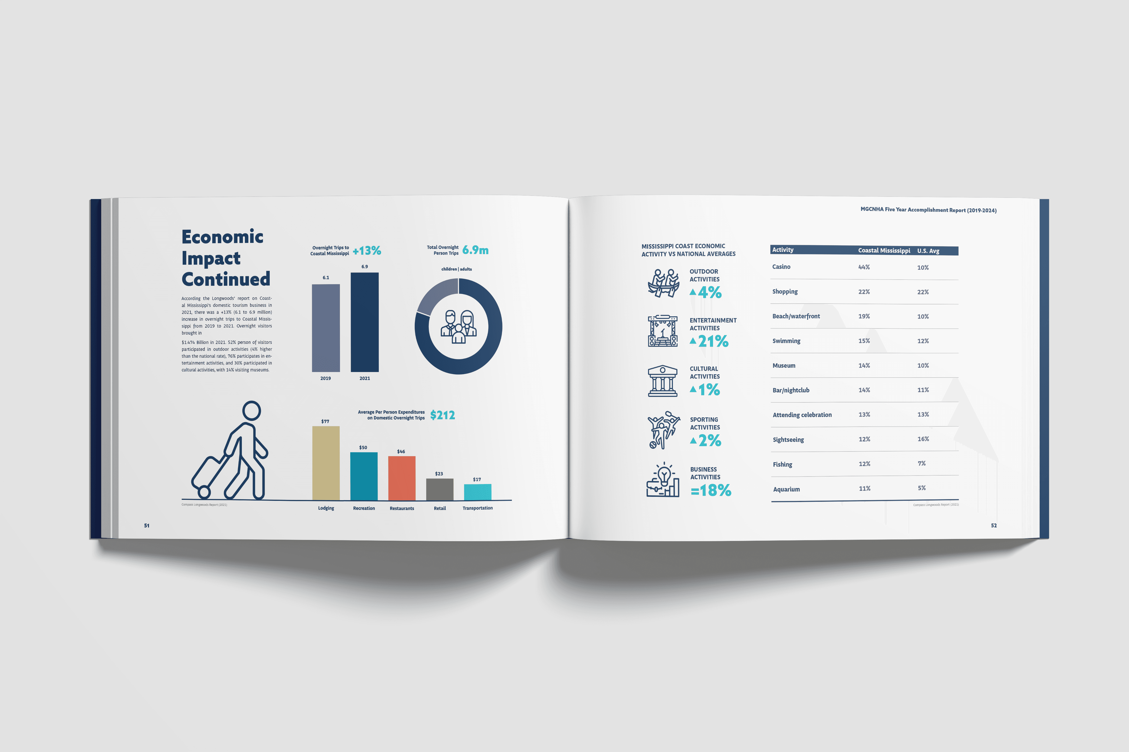 This document was produced for the Mississippi Gulf Coast National Heritage Area as an effort to present their past five years of accomplishments to community members and stakeholders. I worked with the MGCNHA to create a product that reflected their accomplishments both in terms of the stories of the historic gulf coast and the by the numbers growth of this Mississippi Gulf Coast region.